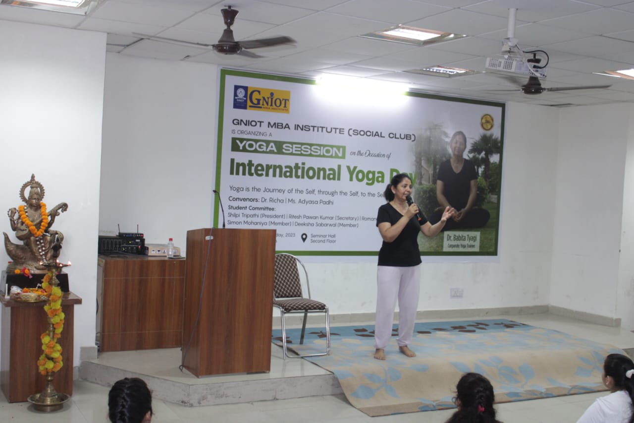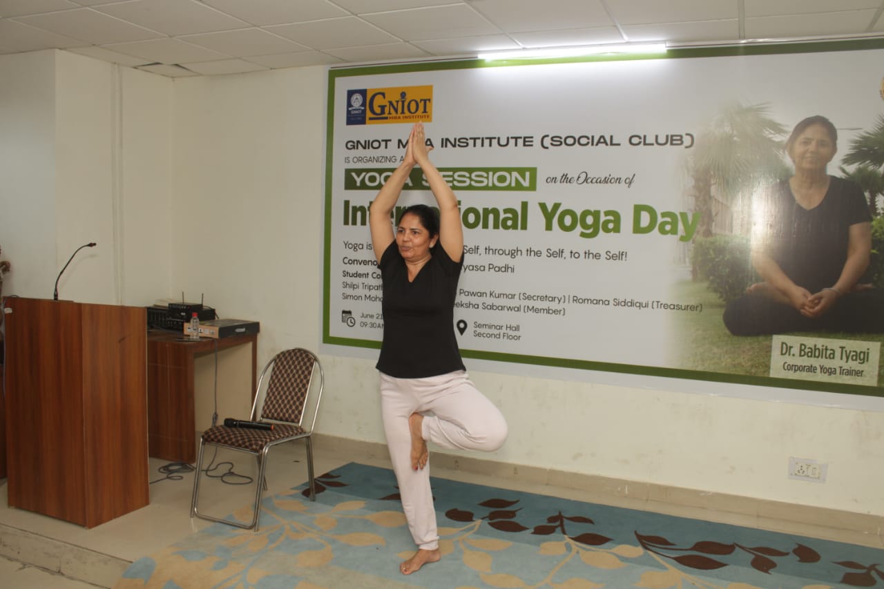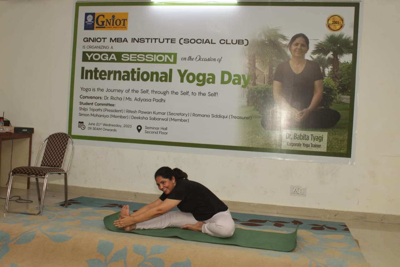 GNIOT MBA Institute organized an energizing yoga session led by an esteemed corporate yoga trainer, Dr. Babita Tyagi. The session aimed to promote physical and mental well-being among the participants, offering them a holistic approach to wellness.