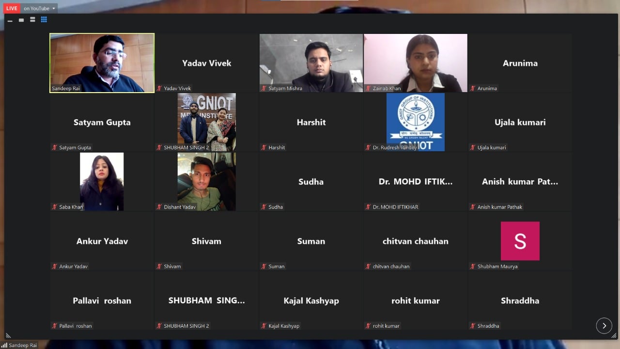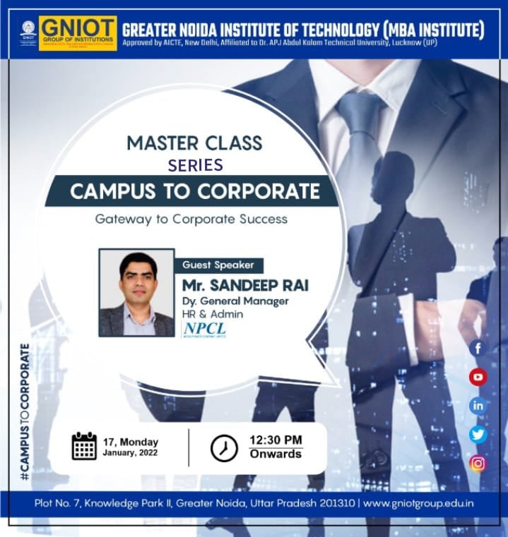 On 17th January 22, Master Class Series entitled "Campus to Corporate" was organised by GNIOT MBA INSTITUTE on zoom platform, 12:30pm onwards.