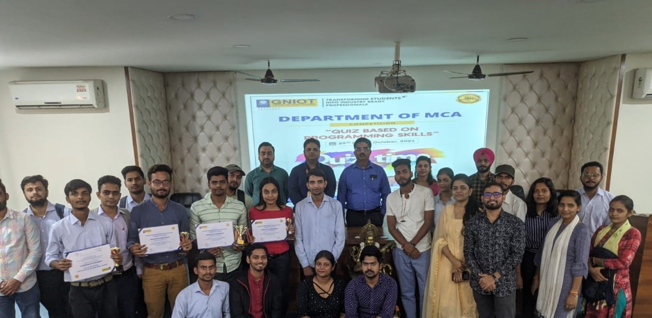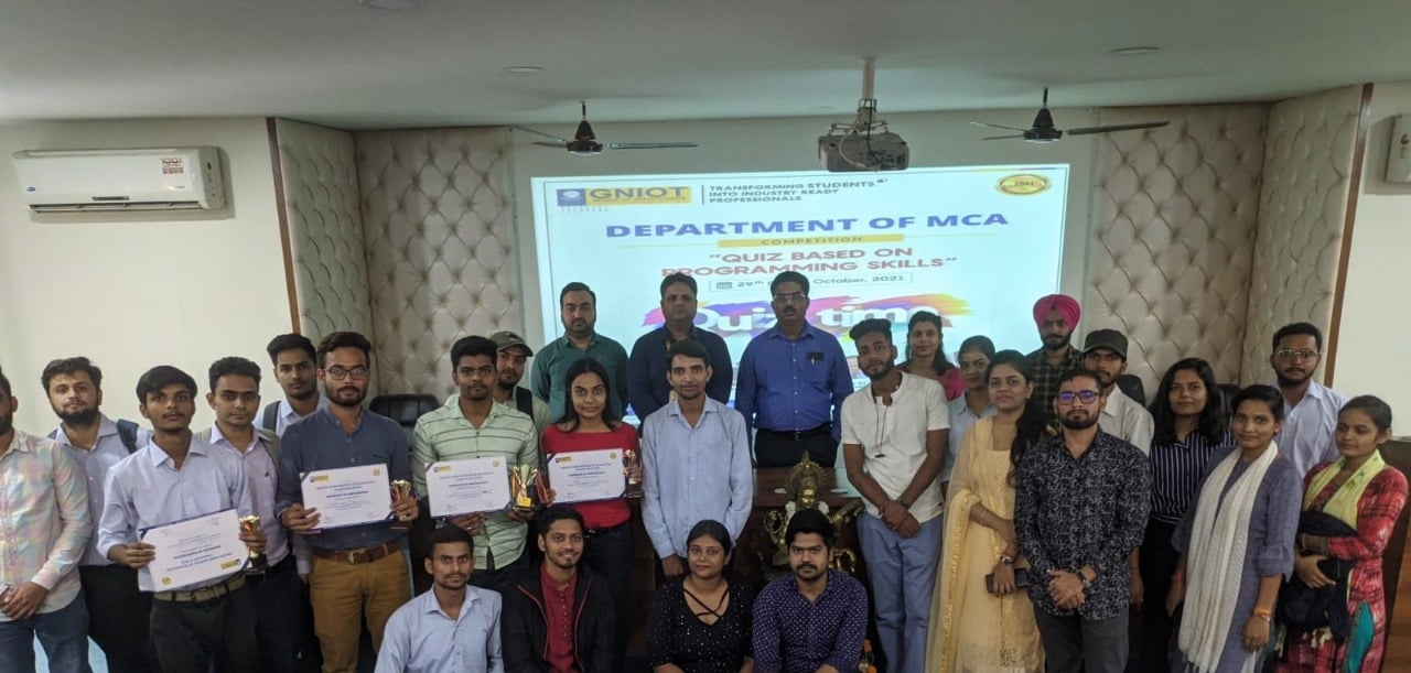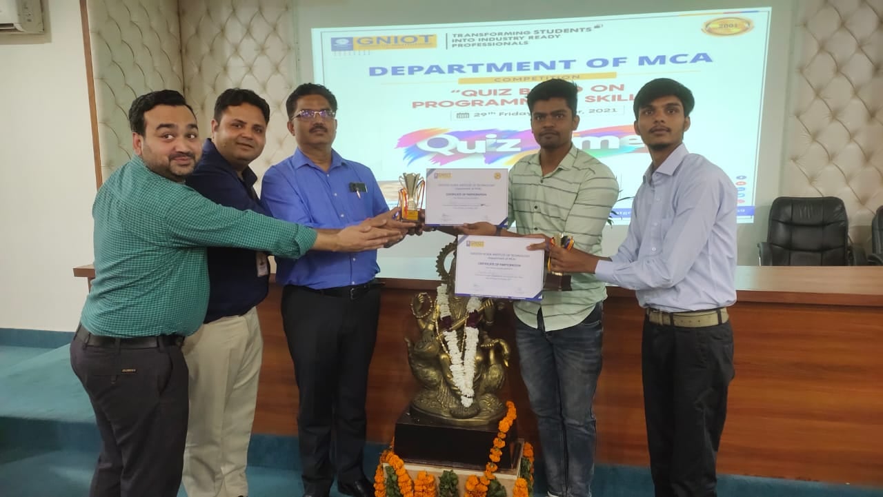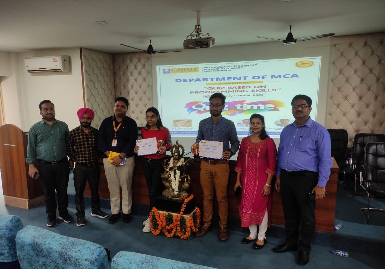 MCA Department of GNIOT organized a quiz based on programming skills on 29th Oct 2021. Fifteen teams participated in this event; Each team was having two members. Six teams selected out of 15 teams after screen round. Six Teams (Team-A, Team-B, Team-C, Team-D, Team-E, Team-F) were asked total 30 questions based on programming skills in three rounds. The Judges in this competition were the HOD-IT Prof. (Dr.) Ramveer Singh and HOD-AIML Prof. (Dr.) Amit Agarwal. Who declared the name of the winners teams with consent of HOD-MCA & Convener of the Event Prof. (Dr.) Sheelesh Kumar Sharma and Co-Convener Md. Salman Siddique. Director Prof. (Dr.) Dhiraj Gupta congratulated to all the winners and honoured them with certificates and trophies. Ayush Singh and Sanjeev of MCA III Semester of Team-C got first prize and Apoorv Kumar Dubey and Parul of MCA III Semester of Team-D got second prize.