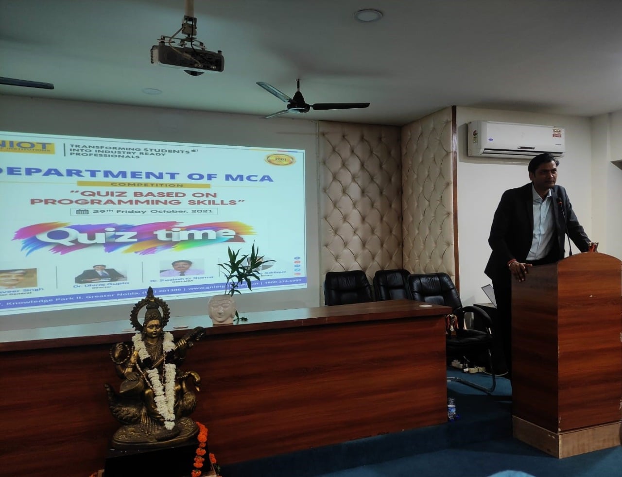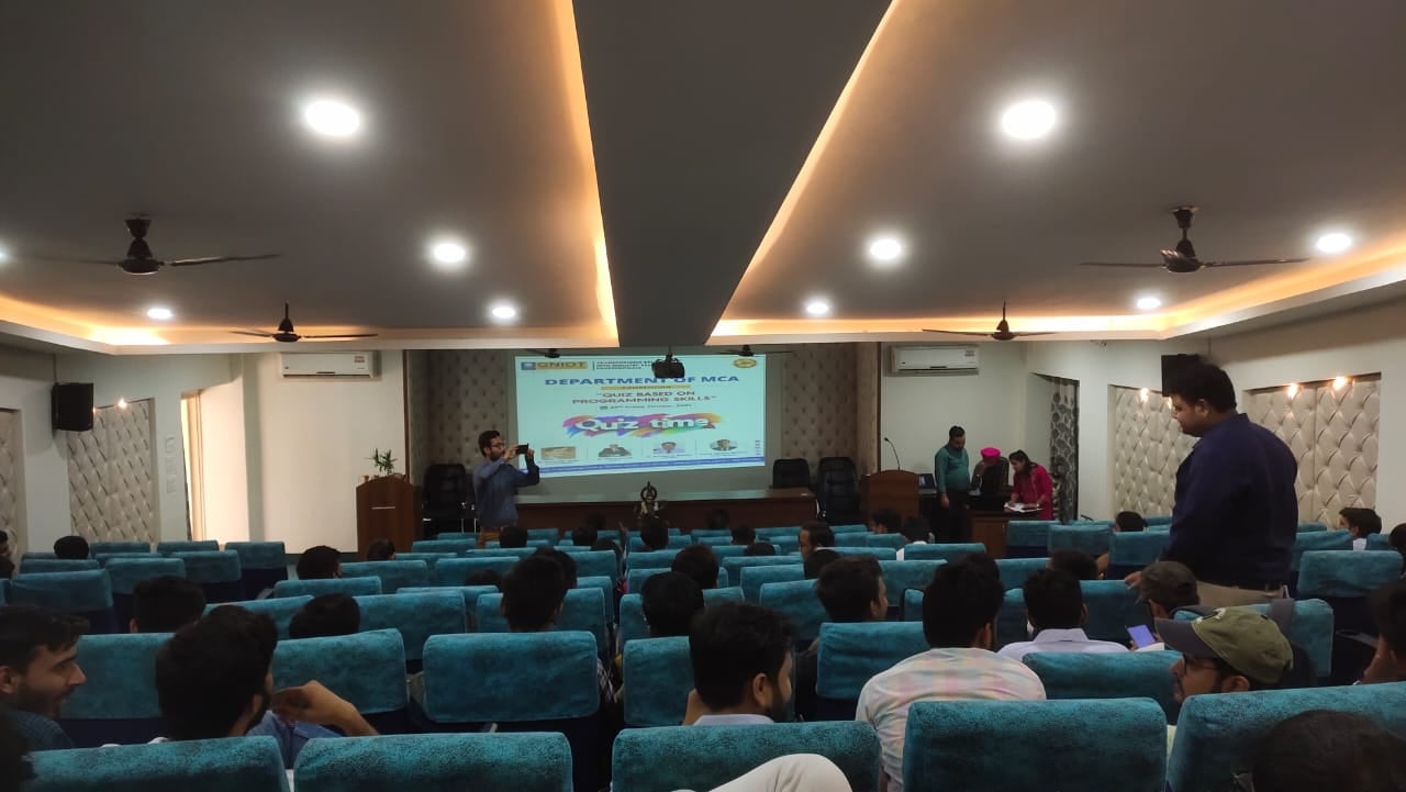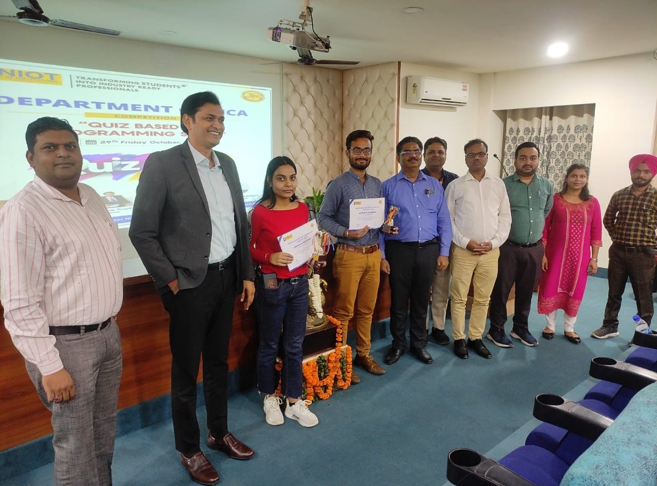 MCA Department of GNIOT organized a quiz based on programming skills on 29th Oct 2021. Fifteen teams participated in this event; Each team was having two members. Six teams selected out of 15 teams after screen round. Six Teams (Team-A, Team-B, Team-C, Team-D, Team-E, Team-F) were asked total 30 questions based on programming skills in three rounds. The Judges in this competition were the HOD-IT Prof. (Dr.) Ramveer Singh and HOD-AIML Prof. (Dr.) Amit Agarwal. Who declared the name of the winners teams with consent of HOD-MCA & Convener of the Event Prof. (Dr.) Sheelesh Kumar Sharma and Co-Convener Md. Salman Siddique. Director Prof. (Dr.) Dhiraj Gupta congratulated to all the winners and honoured them with certificates and trophies. Ayush Singh and Sanjeev of MCA III Semester of Team-C got first prize and Apoorv Kumar Dubey and Parul of MCA III Semester of Team-D got second prize.