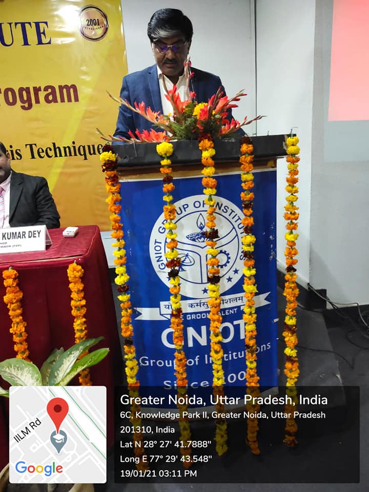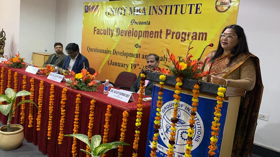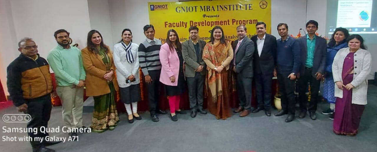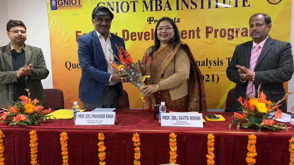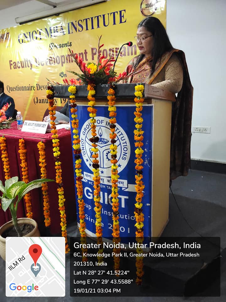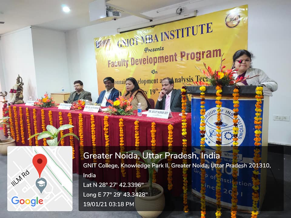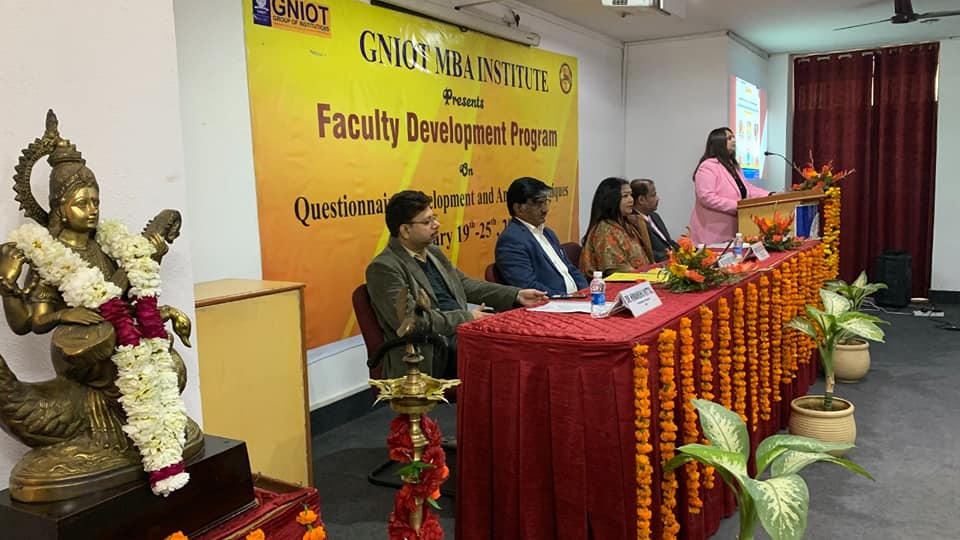 GNIOT MBA Institute is organizing a one week faculty development programme from 19th January to 25th January 2021 on the topic “Questionnaire Development and Analysis Techniques”. Resource person of the FDP is Dr. Pratiksha Tiwari, Faculty, Department of Management, Delhi Institute of Advance Studies. She is Ph.D (MDU Rohtak) & M.Phil (Delhi University).