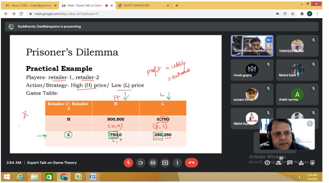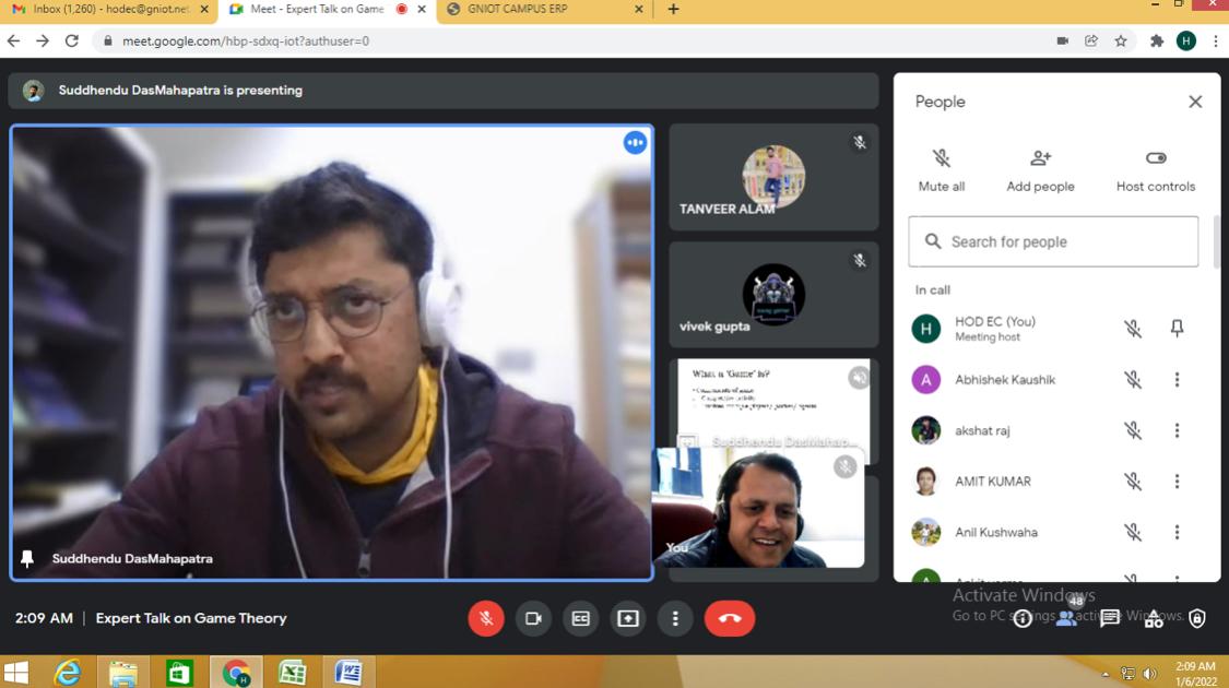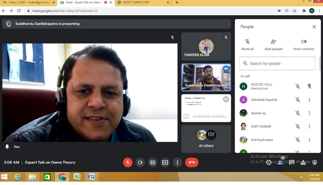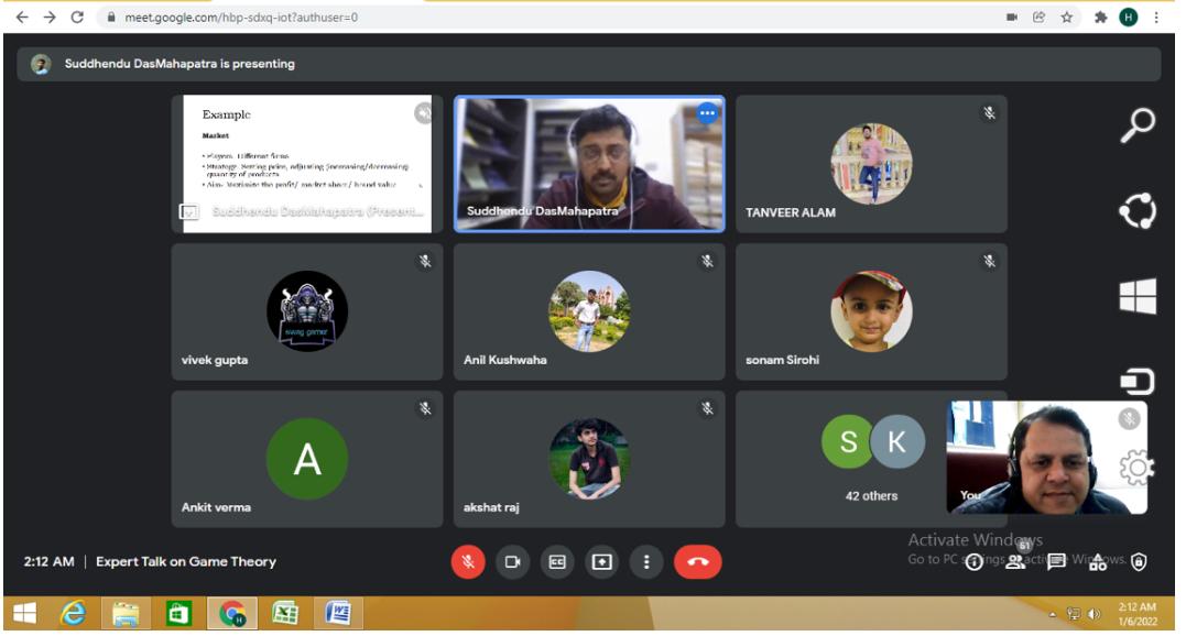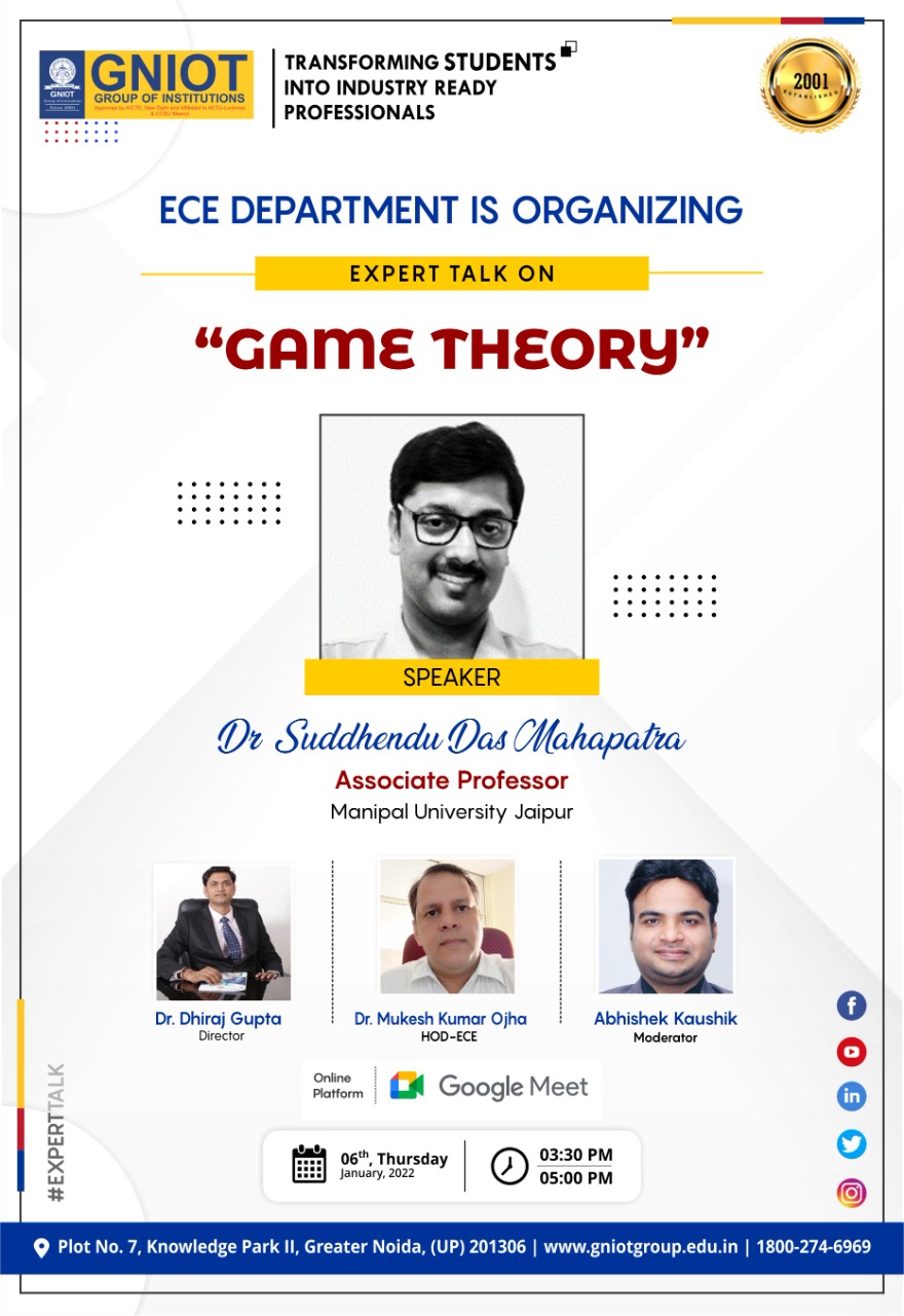 Today department of ECE organised webinar on "Game Theory" By Dr. S. D. Mahapatra (Associate Professor, Manipal University, Jaipur).He thoroghly explained about Game Theory Solutions for the Internet of Things. Emerging Research and Opportunities examines the latest strategies for the management of IoT systems and the application of theoretical models to enhance real-world applications and improve system efficiency. Highlighting innovative algorithms and methods, as well as coverage on cloud computing, cross-domain applications, and energy control. The webinar was attended by 42 ECE second year students and 8 faculty members were the active part of the webinar. The entire session was quite interactive & informative.
