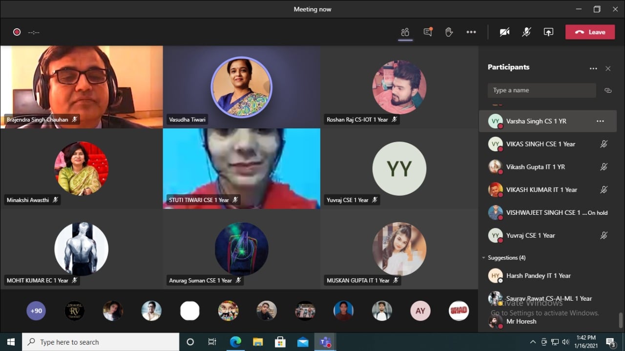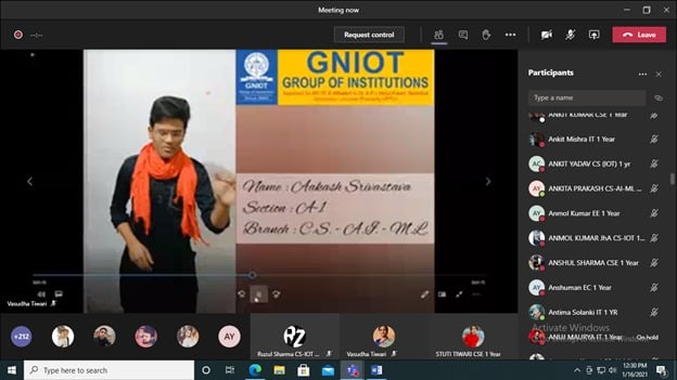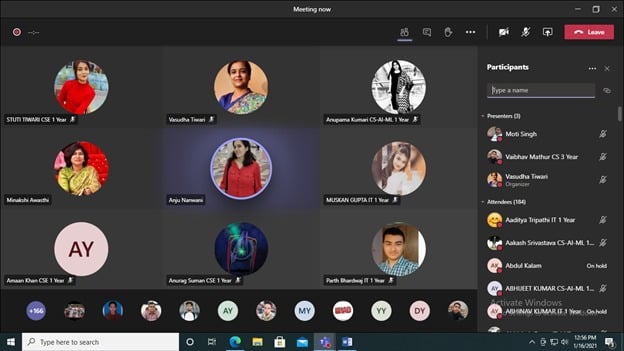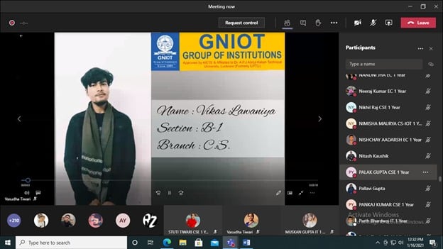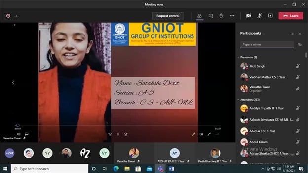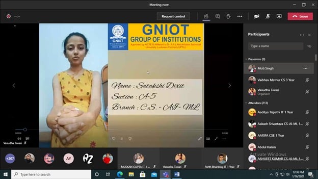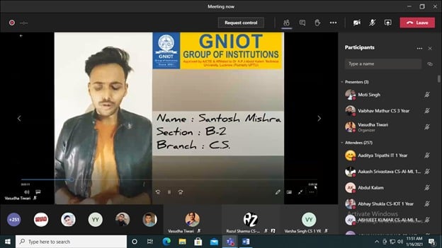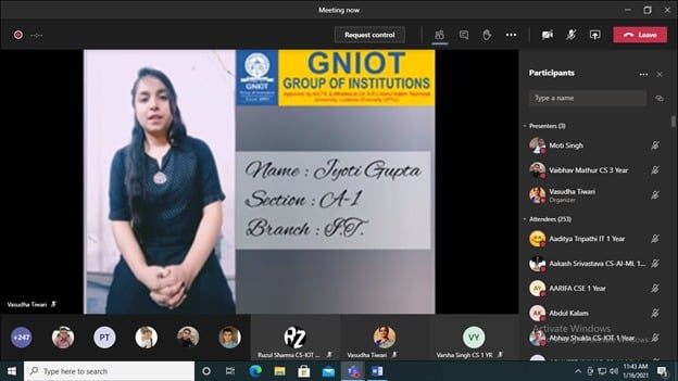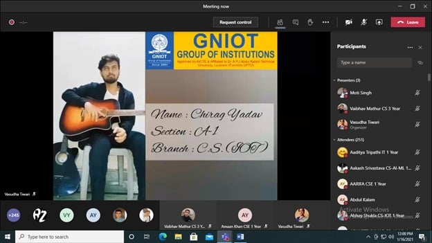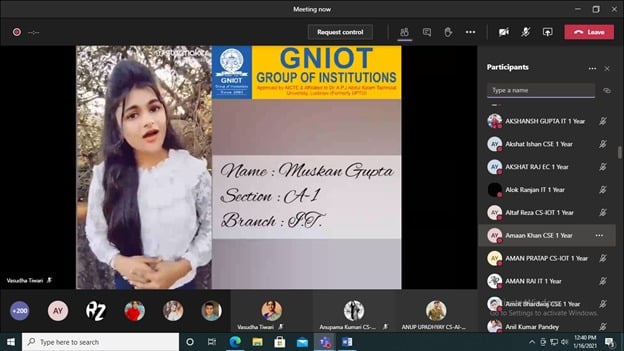 The Department of B.Tech First year organized a cultural event “Swaranjali”- A Kavi Sammelan and Solo-Singing competition, on January 16, 2021. The event was orgainsed online through MS- TEAMS. The program was inaugurated by Dr.Rajesh Goel, Director GNIOT. He also addressed the students and as always motivated them with his words. This was followed by the address of Dr. Dhiraj Gupta, Dean Academics who appreciated the efforts of the students and encouraged them for more such events. Dr. B.S. Chauhan, Dean B.Tech. First Year, welcomed all the dignitaries and appreciated the participants. The program was organized under the guidance of Ms. Vasudha Tiwari and Ms. Minakshi Awasthi and was conducted by the students successfully. The highlight of the event was the kavya jugal bandi presented by the students. Budding poets stole the show with their creativity and the singers mesmerized everyone with their melodious songs. Anchors of the program led the show with confidence and