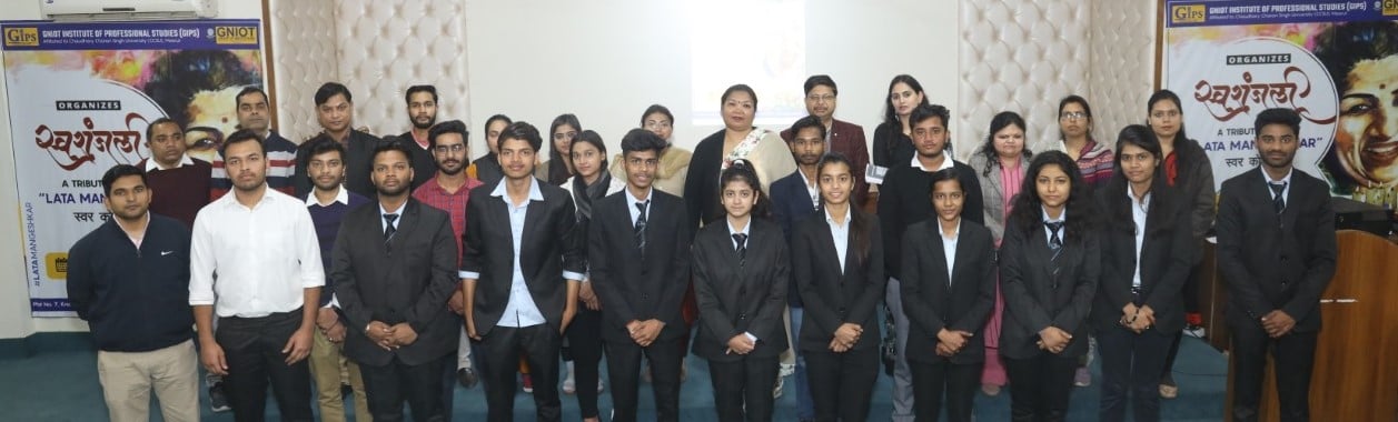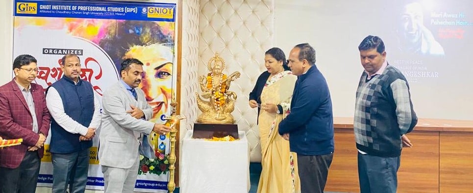 GNIOT Institute of Professional Studies successfully organised Swaranjali a tribute to Swar Kokila Bharat Ratan Lata Mangeshkar Ji on 16th February 2022 from 11 a.m. onwards. Students from BBA, BCA, BCom, B.Sc, PGDM Department showed their talents by singing on songs of Lata Mangeshkar, Mohammad Rafi, and Mr. Kishore Kumar. The event was graced by the presence of Honorable chief guest Dr. Rajesh Pathak (Director of Quality Assurance and Management). Dr. Savita Mohan (Principal GIPS) welcomed the chief guest and motivated the participants for expressing their talents.