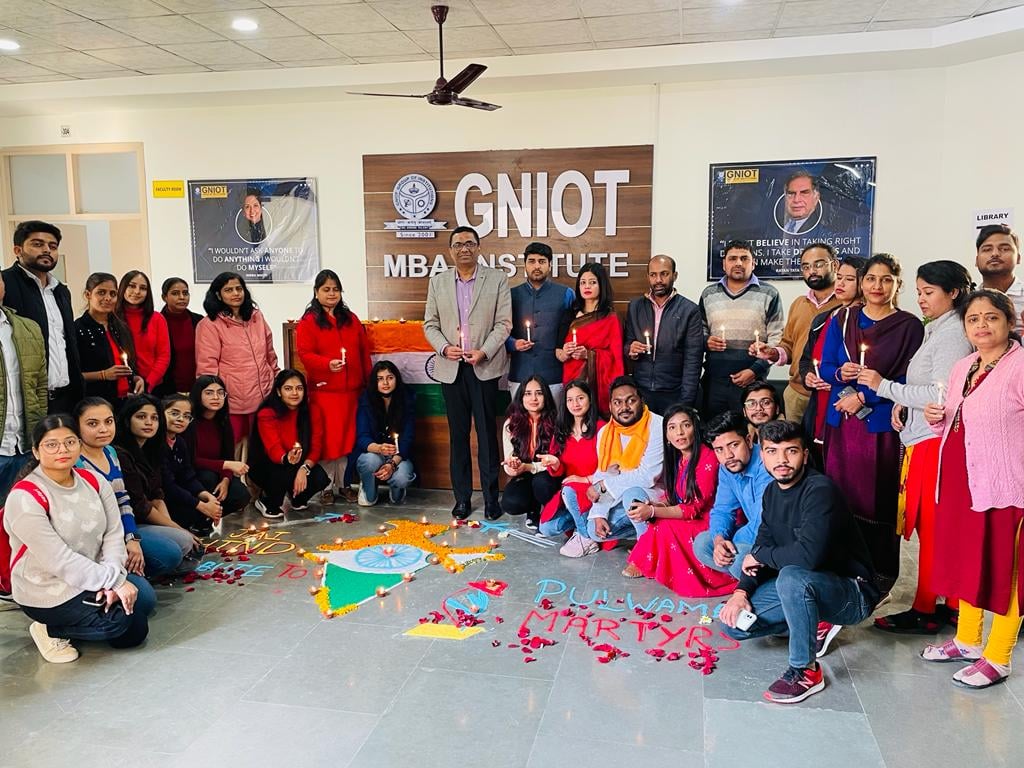 Prof. (Dr.) Rudresh Pandey, Director GNIOT-MBA Institute addressed the students and briefed them about the history of the Pulwama attack, and salute to the immortal brave sons of Maa Bharati. Their sacrifice unites all of us against terrorism.