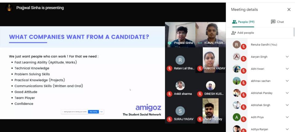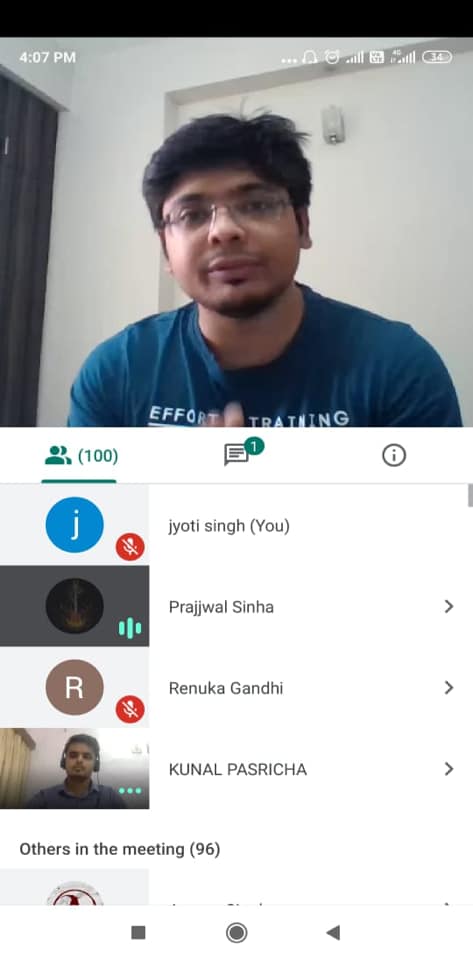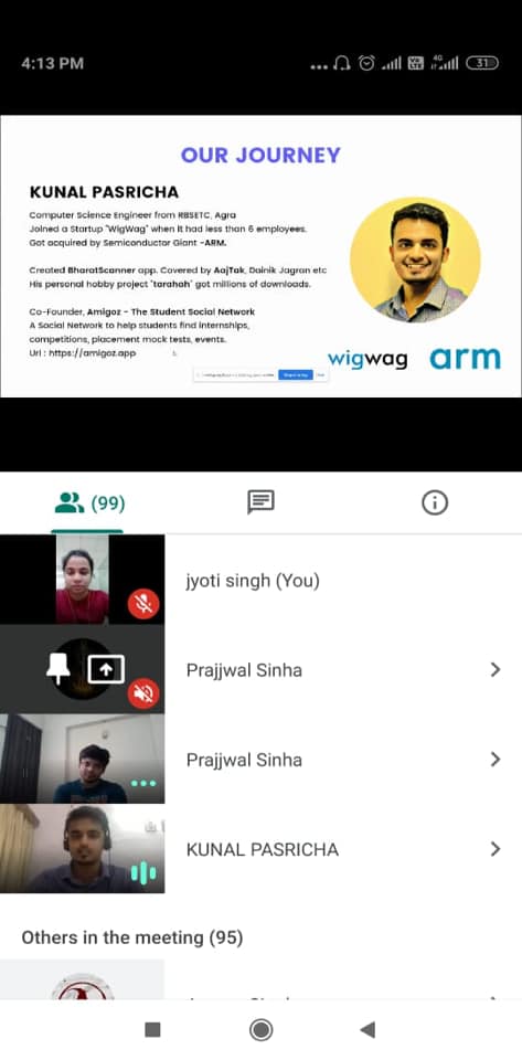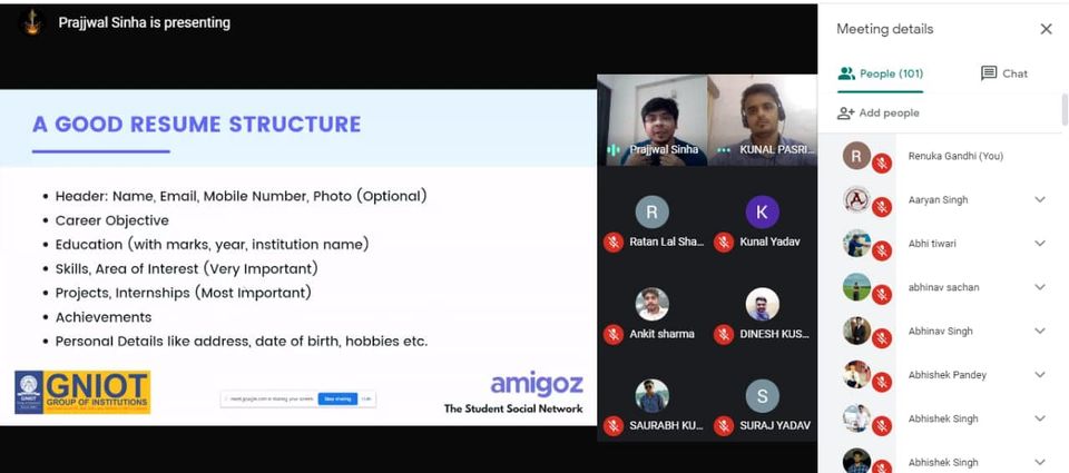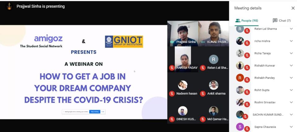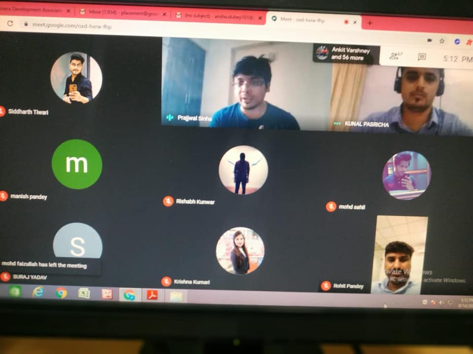 Training and Placement cell , GNIOT GROUP OF INSTITUTIONS, GREATER NOIDA, organized a webinar on “How to get a job in your dream company insipte of Covid 19 crises” on 14th Aug, 2020 between 04:00 PM to 05:00 PM. The speakers Mr. Prajjwal Sinha(Founder,KickHead Software Pvt. Ltd.) and Mr. kunal(Co-Founder, Amigoz) as speakers delivered a optimastic and motivational presentation on How to get a job in your dream conpany inspite of Covid 19 crises" Mr. Prajjwal Sinha explained and guided students regarding , what company looks for while hiring candidate? He also explained a proper way to create resume and also threw light on how students can approach compaines. Student must undergo throughAI/ML and python courses. Mr. Kunal laid emphasis on,how to prepare for interview, do's and dont's at the time of interview. Students of CS/IT/MCA were highly benefited by the session.