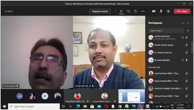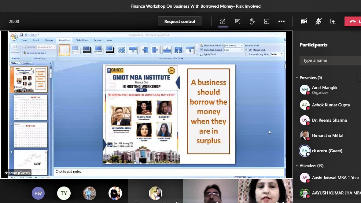 For polishing the skills of students related to investment and fund management of students as a Finance Manager, Finance Club of GNIOT MBA Institute organized a workshop on the topic “Business With Borrowed Money- Risk Involved” The expert of the session was Mr. Rajendra Arora, a certified Wealth Manager and CEO of Smart Equity Broker Pvt. Ltd. He is also an investment trainer from more than 25 year.