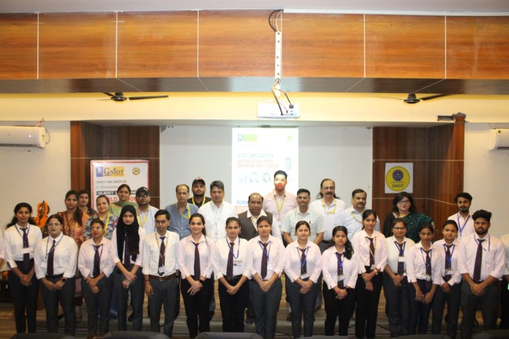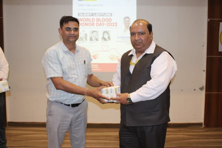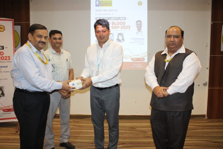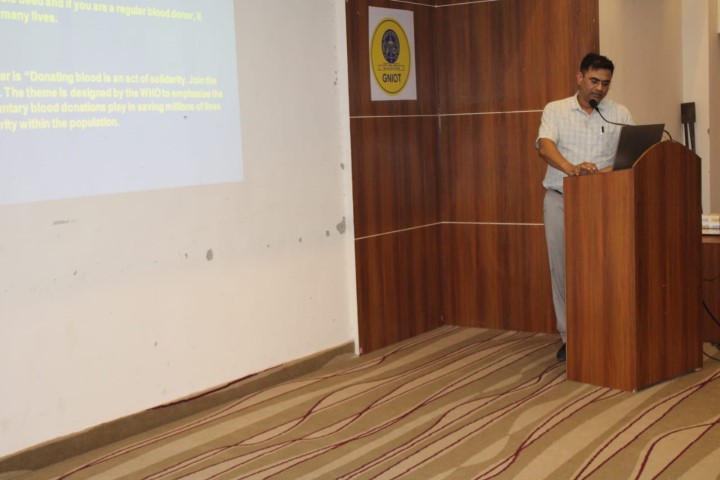 World Blood Donor Day, 2023 was celebrated with great enthusiasm at GNIOT MBA Institute. The audience was highly encouraged and pledged to donate the blood. The speaker for the session was Dr Ashwani Kansal, Consultant Physician and Medical Superintendent, Yatharth Super Speciality Hospital,Greater Noida. The speaker highlighted the importance and benefits of blood donation, various blood groups and blood components, the process of blood transfusion, precautions before blood donations. The Honorable speaker brought forward various facts and myths surrounding blood donation. All the key points were summarized by Ms Adyasa Padhi (Assistant Professor), Coordinator. The session concluded with a vote of thanks by Director Prof (Dr.)Anshul Sharma who encouraged the audience for blood donations through his golden words of motivation