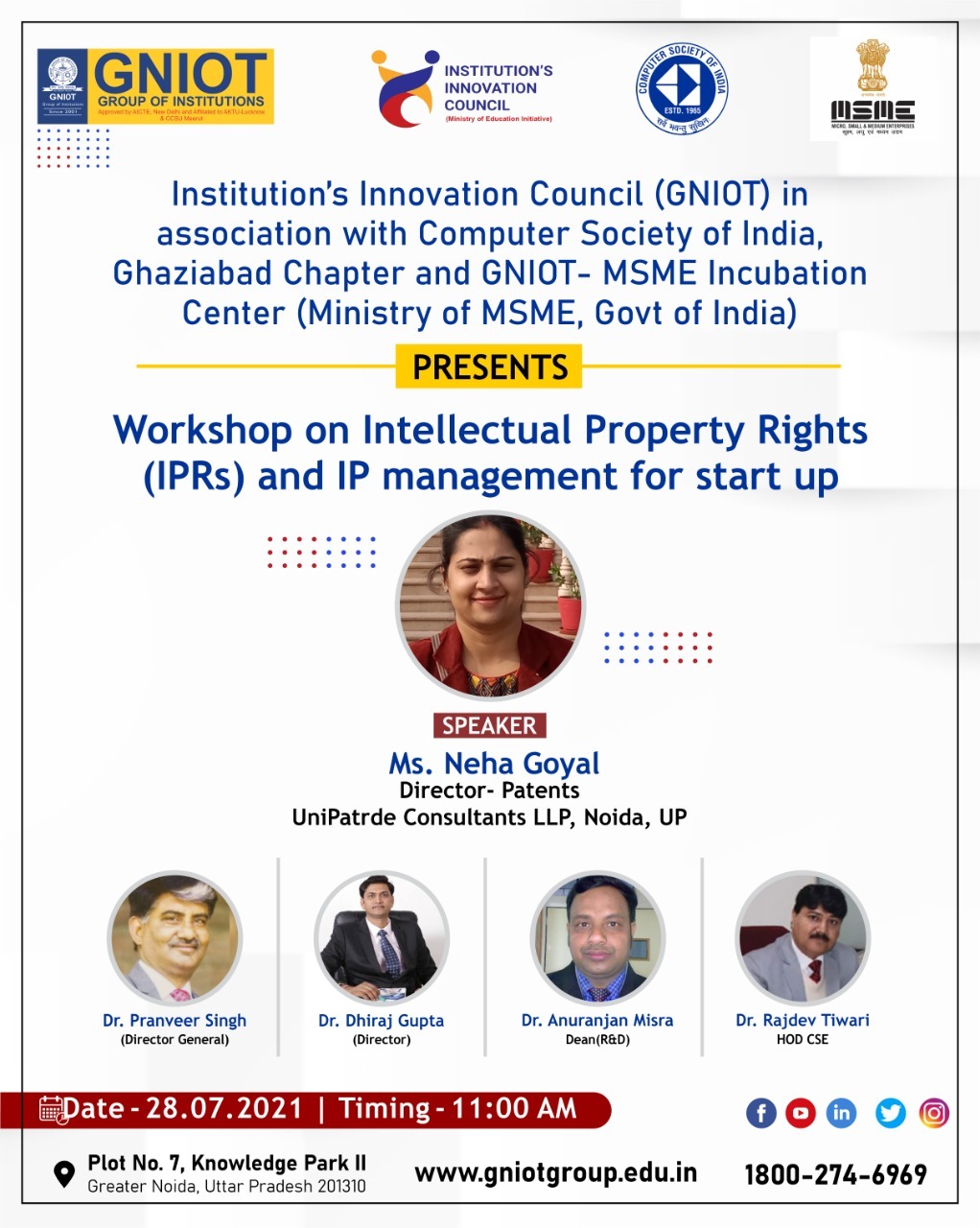 GNIOT-Institute's Innovation Council (An Initiative of Ministry of Education, Govt. of India) in association with Computer Society of India, Ghaziabad Chapter and GNIOT- Business Incubation Centre (an Initiative of Ministry of MSME, Govt. of India) will organize a live workshop is Intellectual Property Rights (IPRs) and IP management for start up on 28.07.2021 at 11 AM.. The Speaker of the event will be Ms. Neha Goyal, Director - Patents, UniPatrde Consultants LLP, Noida, UP. Intellectual property rights are the rights given to persons over the creations of their minds. They usually give the creator an exclusive right over the use of his/her creation for a certain period of time. There are four types of IPR, Trade Secrets, Patents, Copyrights. And Trademarks.. #GNIOT #GNIOTCampus #Institute #College #Campus #GreaterNoida #MinistryofMSME #LiveWorkshop #ComputerSocietyofIndia