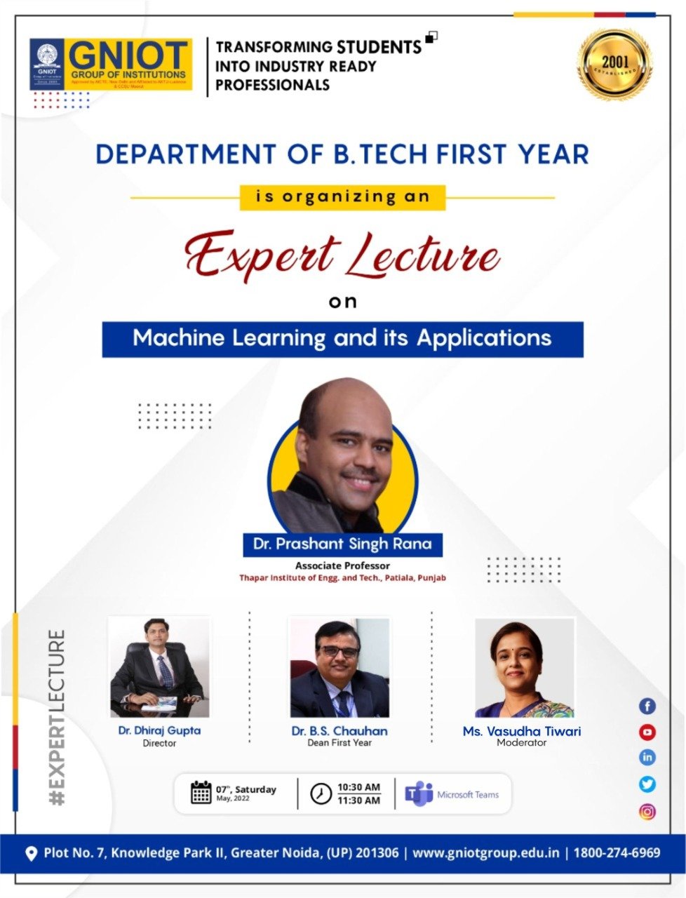 Machine learning is magical and can make machines learn and predict, it is going to a game changer in the future. The Department of B.Tech First Year is organising an expert lecture on “Machine Learning and Its Applications” on Saturday, 7th May, 2022 from 10.30 am onwards in online mode through MS Teams. Dr. Prashant Singh Rana, Associate Professor, Thapar Institute of Engg. & technology, an expert in the area of Machine Learning and Deep Learning will be enlightening the students of B.Tech First year with this emerging technology in a very simplified way.