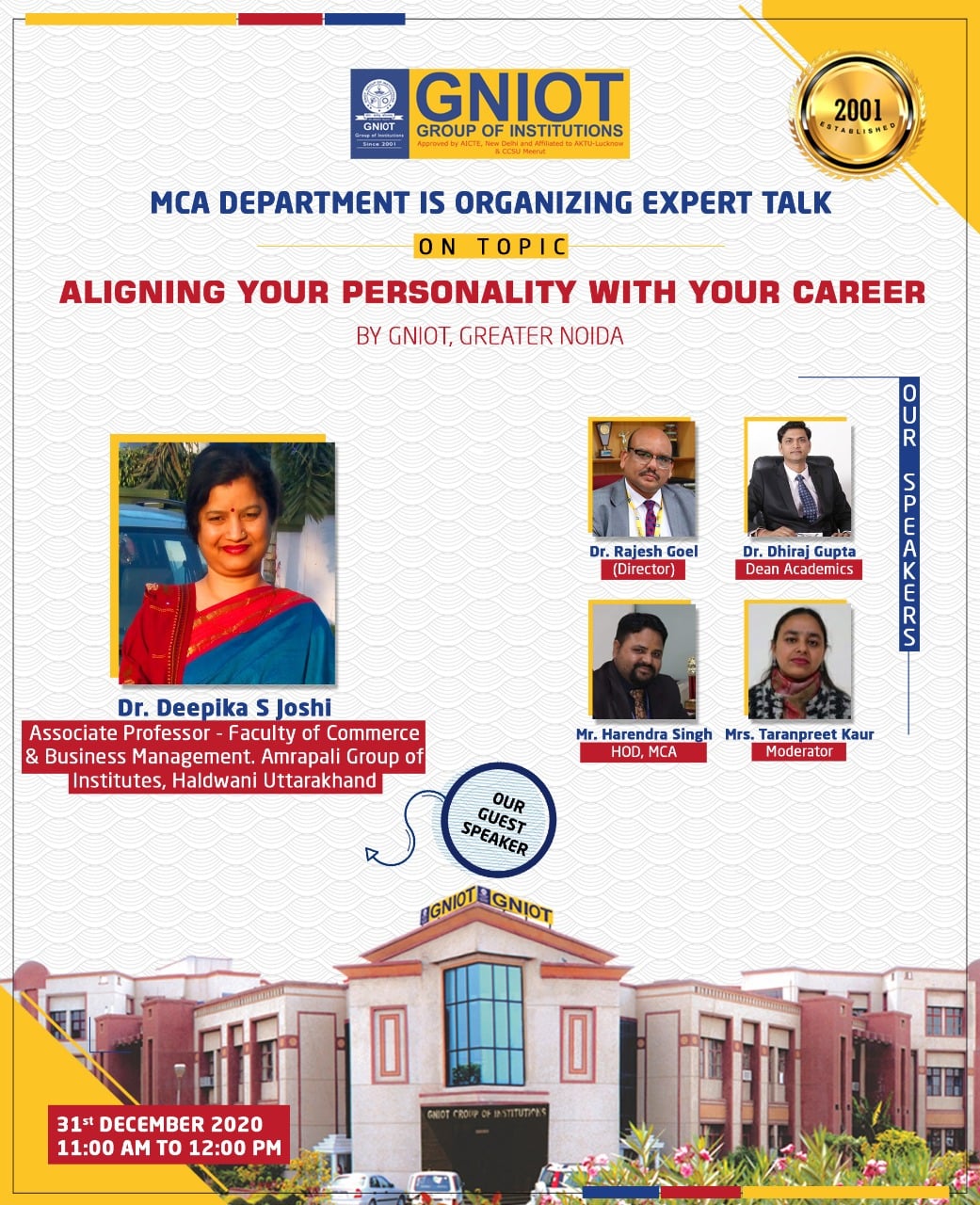 Department of MCA (Master of Computer Application) is organizing a expert talk on the topic "Aligning your Personality with your career" on 31st December, 2020 from 11:00 AM to 12:00 PM.