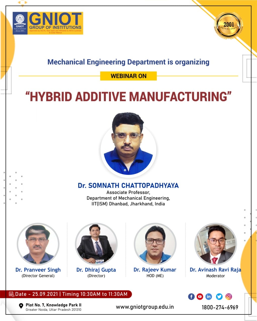 Our future success is directly proportional to understand, adopt and integrate new technology into our work - Sukant Ratnakar (Author). The department of Mechanical Engineering is organising an expert lecture on "HYBRID ADDITIVE MANUFACTURING" on 25/09/2021 (Saturday) at 10:30 am. The expert talk will be delivered by Dr. Somnath Chattopadhyaya, Associate professor, Department of Mechanical Engineering, IIT (Indian School of Mines) Dhanbad, Jharkhand, India. The main objective of this webinar is to make aware the students about new technology in the field of Mechanical Engineering.