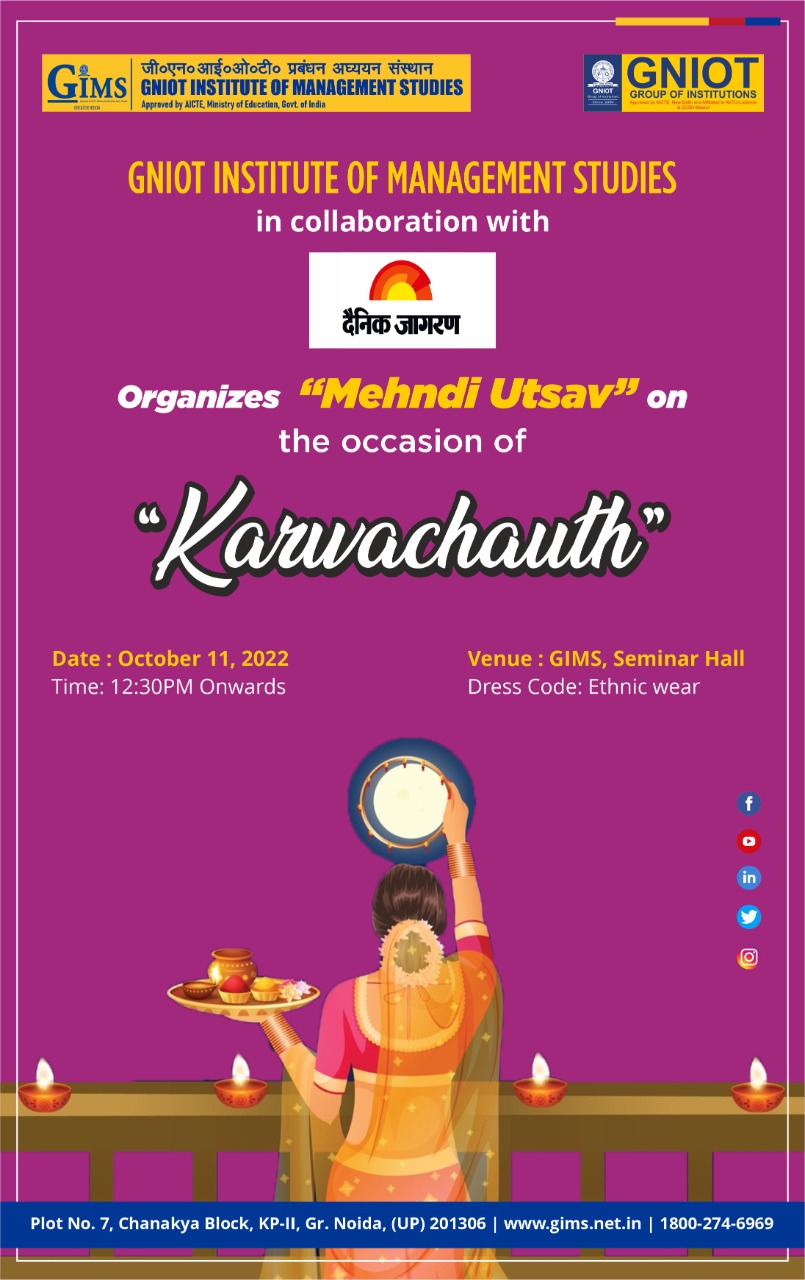 GIMS, Greater Noida in association with Dainik Jagran is celebrating the “Mehndi Utsav” on October 11, 2022 from 12:30 PM onwards at GIMS Seminar Hall, II Floor, Chanakya Block. The event is to celebrate the festival of Karwachauth with Mehndi , sumptuous snacks, fun games, tambola and lots music & dance. There are lots of Prizes and Titles to be won for the lovely ladies of the GNIOT Group.