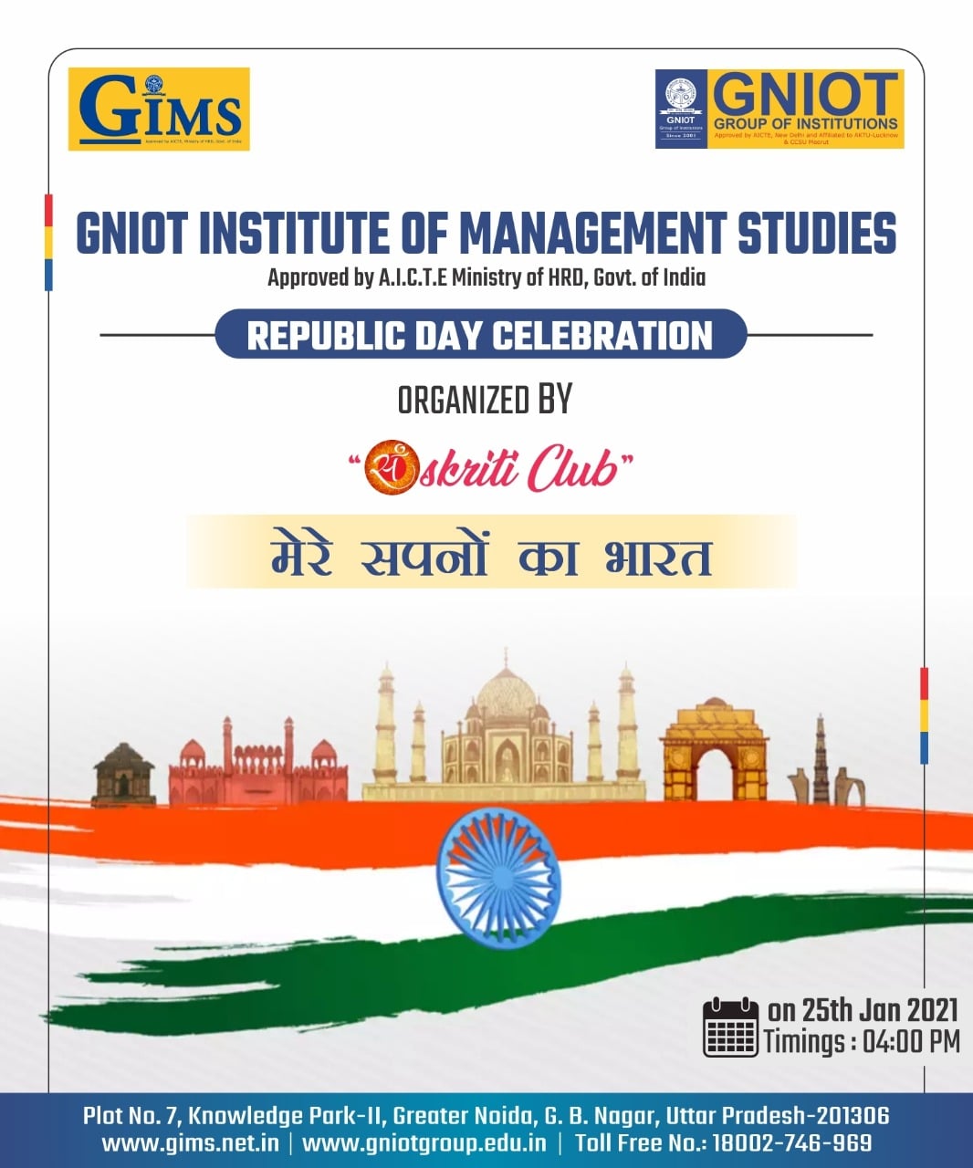 On the occasion of Republic Day, SANSKRITI CLUB (GNIOT Institute of Management Studies, GIMS) is organizing an event on 25th January '21. Theme for the event is 'Mere Sapno ka Bharat'. Students will showcase patriotism by participating in activities like classical dancing & singing, speeches and extempore competition in Hindi.