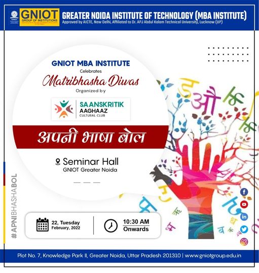 To mark the celebration of "Mother Tongue Day" on 22 February 2022, GNIOT MBA Institute's Cultural Club is organizing "Speak Your Language". Club is organizing poster making competition and poetry/poetry reading competition for all students of MBA and IMBA course. It aims to promote awareness of linguistic and cultural diversity and promote multilingualism. Students will get a chance to portray their language science skills by attending both programs.