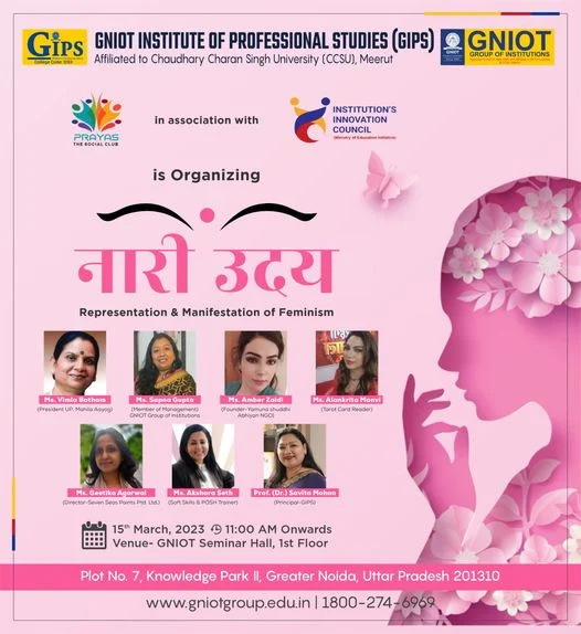 GNIOT Institute of Professional Studies will Organize नारी उदय- Representation & Manifestation of Feminism under the banner of Social Club on 15 March 2023. The objective of the event is to celebrate womanhood and cherish the rise of women in each and every sector.