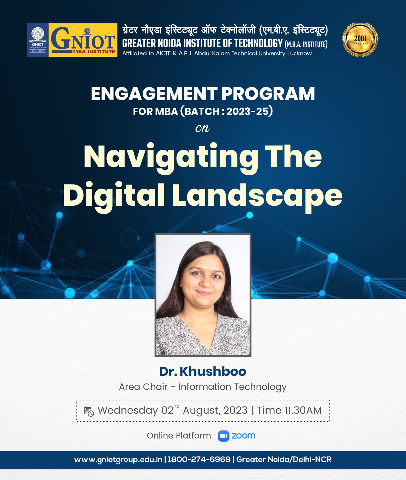 GNIOT MBA Institute is organising an online engagement program for MBA batch (2023-25). The program will be led by the esteemed resource person, Dr. khushboo who is an expert in IT. Her session will be on topic - Navigating the Digital Landscape.