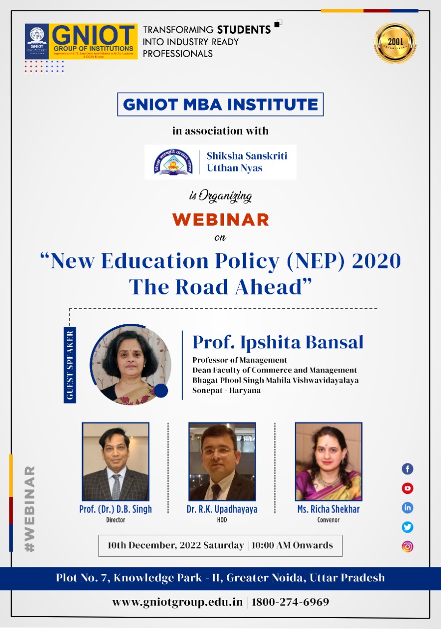 GNIOT MBA Institute had organized a webinar on “NEP 2020: The Road Ahead” on 10/12/22 at 10:00am which was attended by the faculty members. The Guest Speaker was Prof (Dr) Ipshita Bansal, Professor and Dean with Department of Management Studies at Bhagat Phool Singh Mahila Vishwavidyalaya, Sonipat Haryana. The webinar was very informative and offered clarity on the various nuances of the New Education Policy’2020.