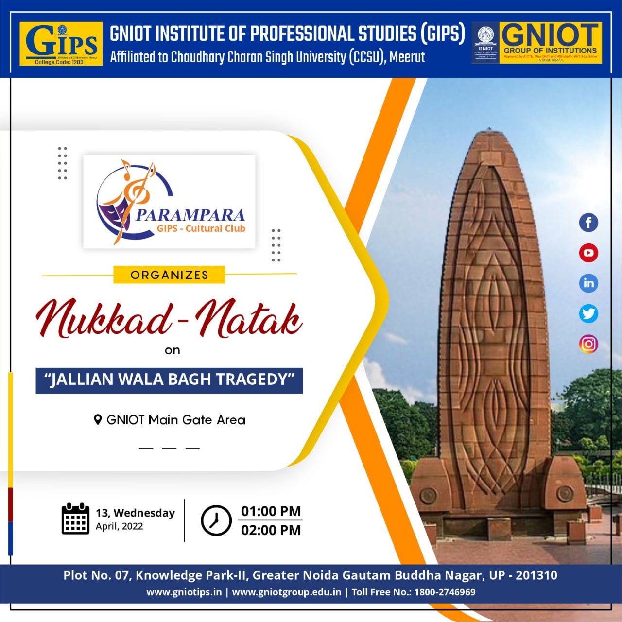 PARAMPARA the CULTURAL CLUB of Greater Noida Institute of Professional Studies is organising a NUKKAD NATAK( streetplay) on JALLIAN WALA BAGH TRAGEDY for paying tribute to the martyrs of jallian walabagh massacre on 13 April 1919.