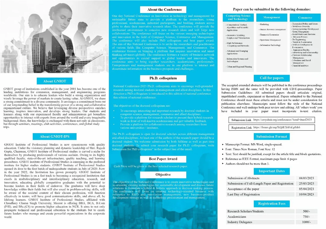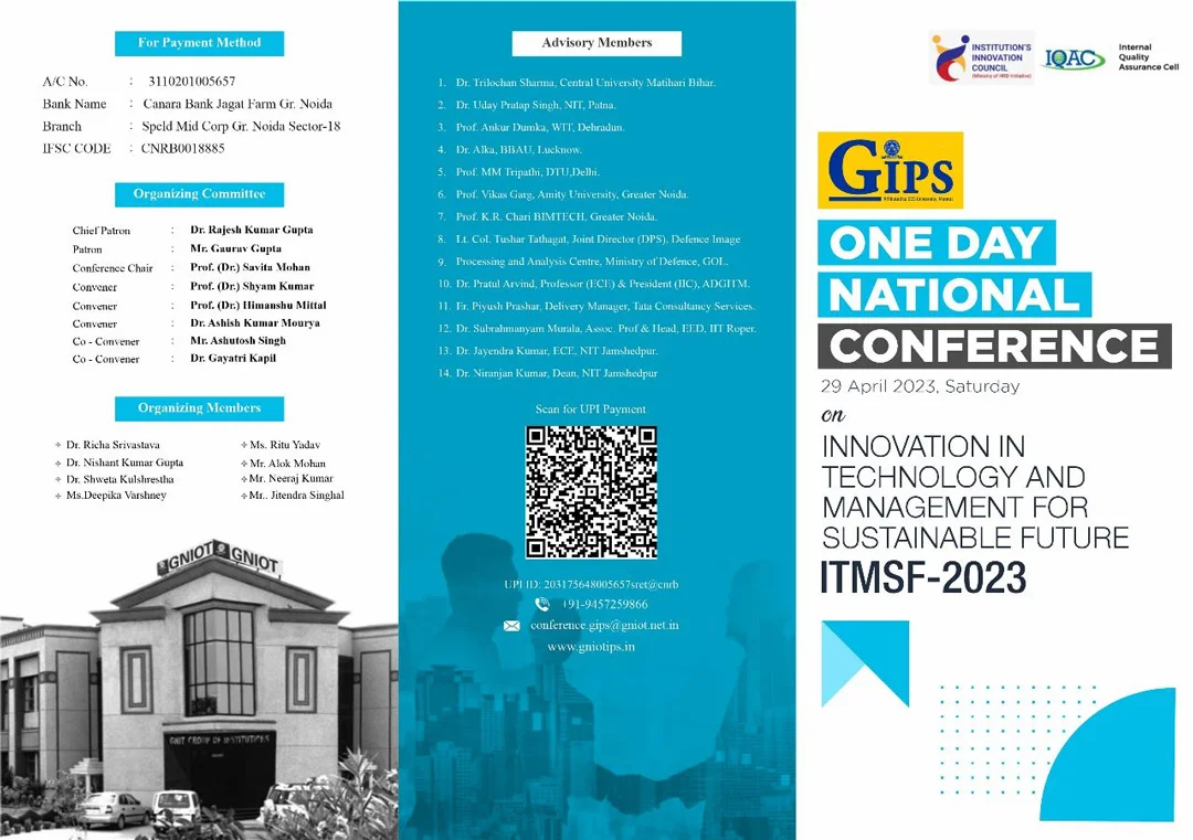 GNIOT Institute of Professional Studies is organizing One Day National Conference and PhD Colloquium “Innovation in Technology and Management for Sustainable ” ITMSF-2023 on 29th April 2023 focusing researchers in the area of Computer Science, Management and Commerce. Important dates are- Submission of Abstract- 4/3/2023, Full paper - 25/3/2023, Last date of registration - 10/4/2023. Researchers away from NCR can present their research papers through online mode. For more details please refer to the brochure enclosed.