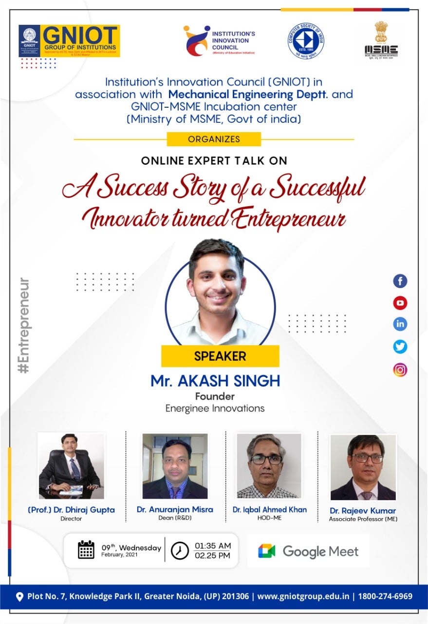 Institution's Innovation Council (GNIOT-132) in association with Mechanical Engineering Department and GNIOT-MSME Incubation Center is organizing an online expert talk on "A Success story of a successful Innovator turned Entrepreneur"*