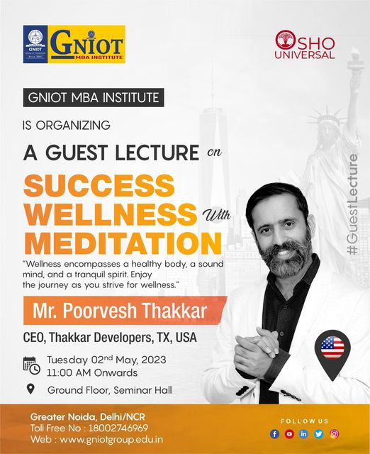 GNIOT MBA INSTITUTE is going to organise a Guest Lecture on "Success, wellness with meditation." This session will be taken by well renowned Motivator and guide Mr. Proorvesh Thakkar from TX USA.