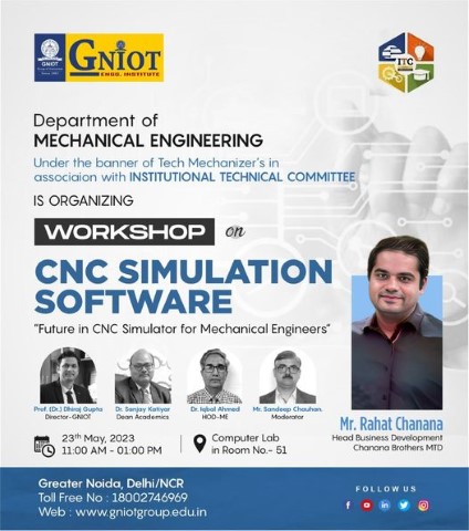 Mechanical Engineering Department is organizing a Workshop under the aegis of Tech Mechanizer and in association with Institutional Technical Committee on "CNC Simulation Software" for Mechanical engineering students on May 23, 2023 (Tuesday) from 11:00 AM onwards in Room No.51. The workshop is conducted by an expert Mr. Rahat Chanana (Head Business Development) from Chanana Brother MTD,