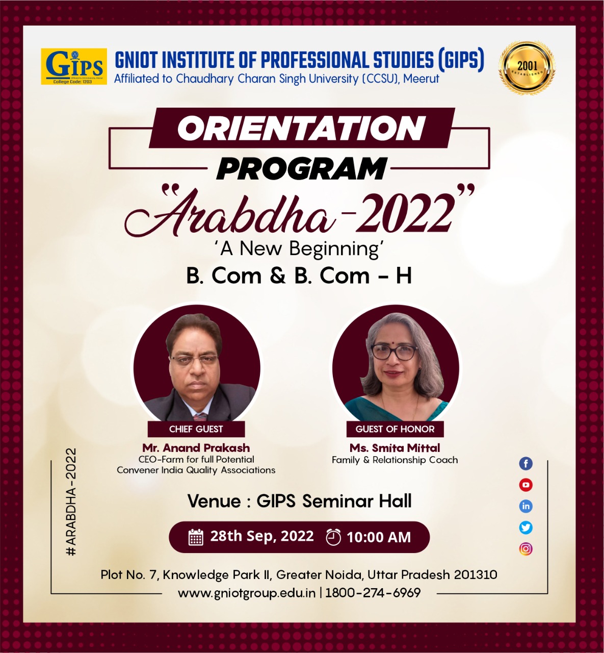 GNIOT - IPS, Greater Noida is organizing “ARABDHA – 2022” (A New Beginning), the Orientation Program for its B.Com. 1st-year students on September 28th, 2022 (Wednesday) from 10:00 am onwards, at (GIPS) Seminar Hall.