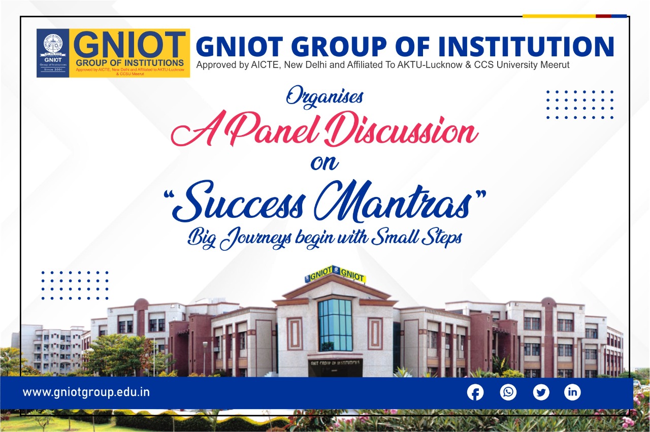 GNIOT Group of Institutions organizes a panel discussion on "Success Mantras-Big Journeys begin with Small Steps" on 21st September 2021. Student entrepreneur in this way get an opportunity to lead an independent life and at the same time they enable others in gaining gainful employment. Students will be future ne36Entrepreneurs, process of establishing those ideas in the form of business by introducing new goods, services and technologies to the market. Students will be motivated a lot to improve managerial skills such as decision making and being able to do so confidently boost their self-esteem and make them industry ready. There will be a galaxy of eminent industry and academicians like Mr. Puneet Aggarwal -Director Pushpanjali Group, Mr. Puneet Bhatnagar - Director, TECHFOUR, Mr. Rajiv Kental - President Amar Ujala, Mr. Ramesh Batlish - Managing Partner, FITJEE, Mr. Suman Nayak- Chief General Manager, NIPPON Audiotronix Pvt. Ltd and few more.
