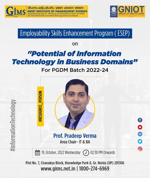 Information technology has the potential to revolutionize the way businesses operate. In this session on "Potential of Information Technology in Business Domains" being organized for the PGDM Batch 2022-24, we will discuss and explore all such areas and understand how IT is creating revolution in different business domains.