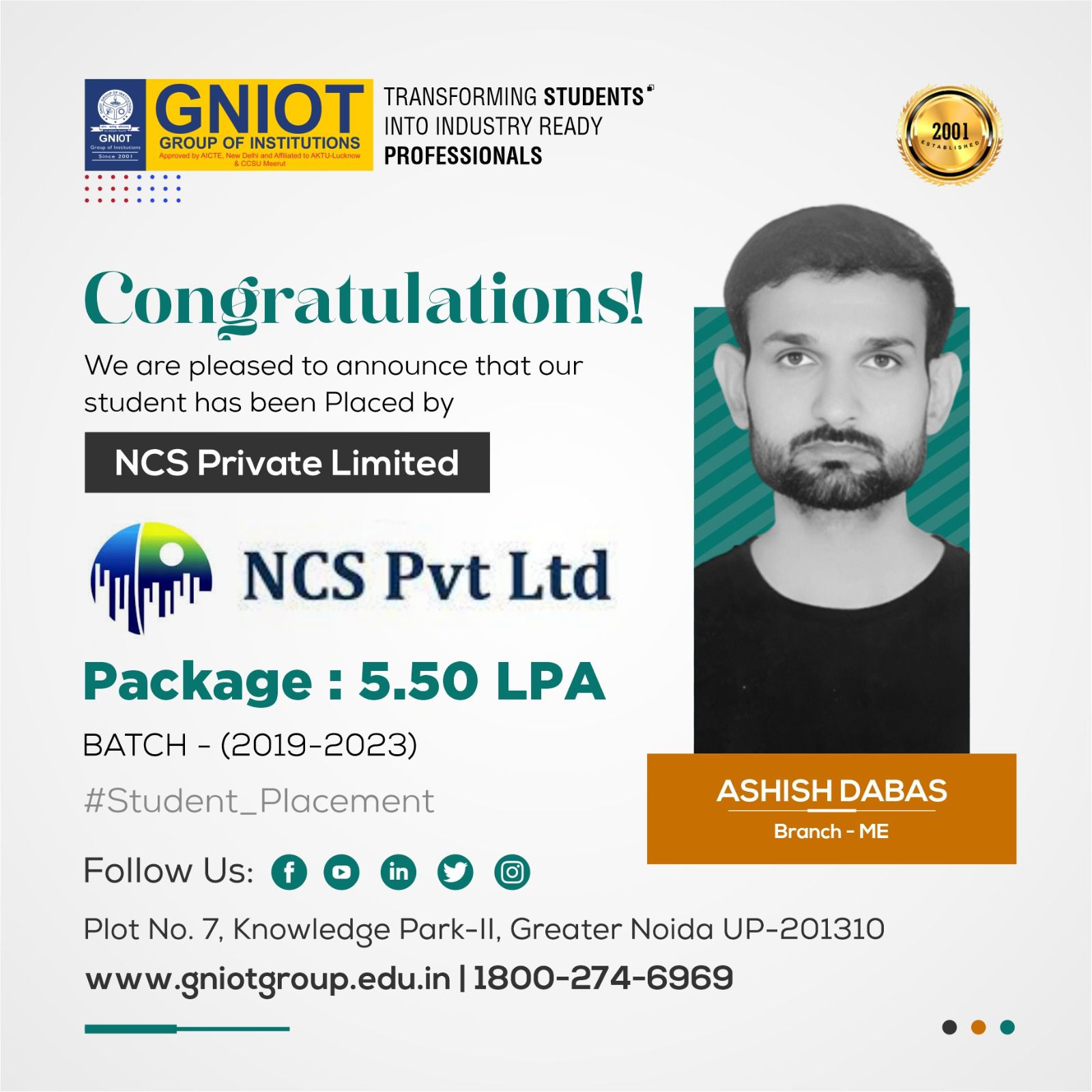 Congratulations! We are pleased to announce that our student Ashish Dabas has been placed by NCS Private Limited, with a salary package of 5.50 LPA.