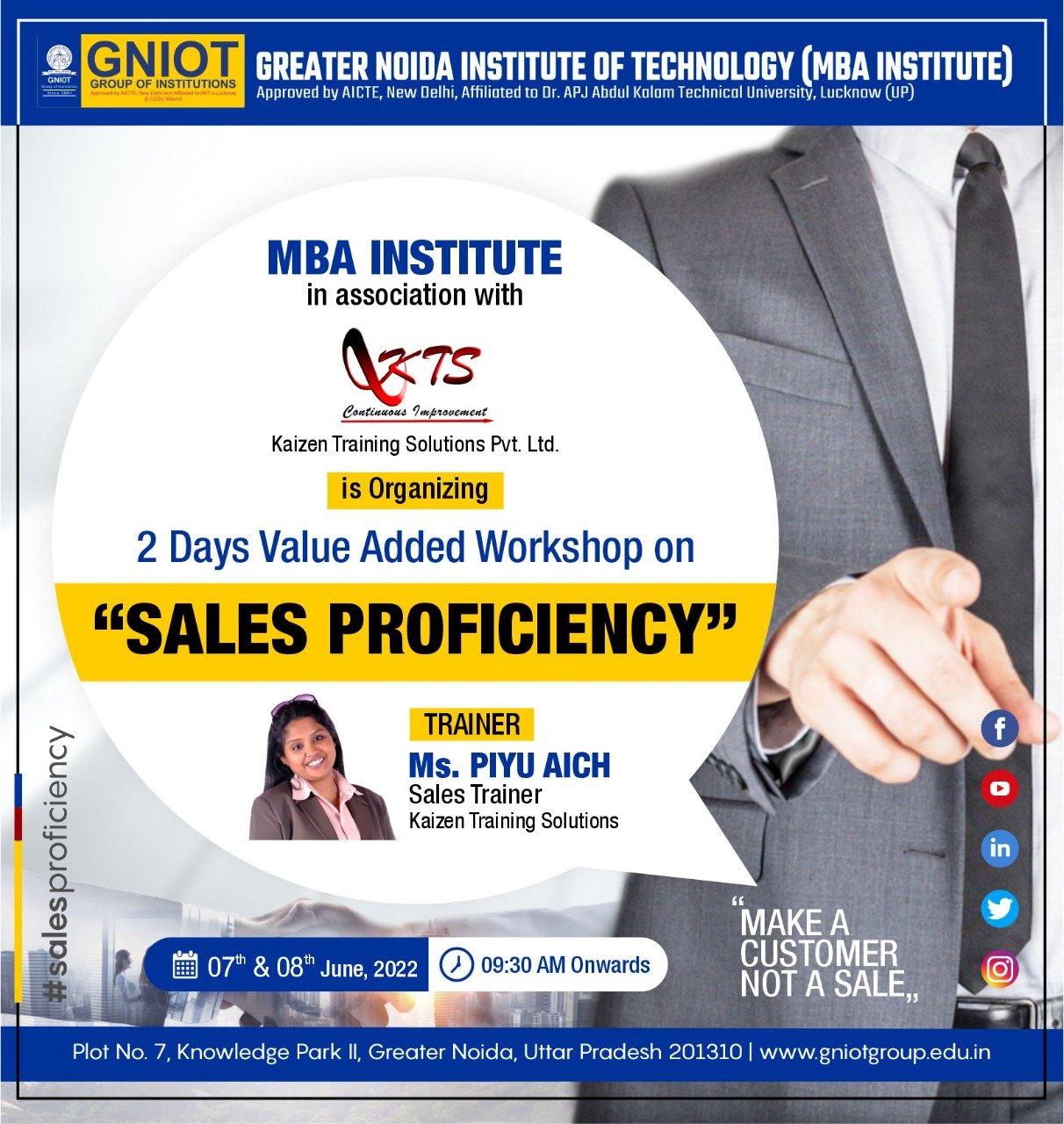 GNIOT MBA Institute is organizing a two days Value Added Workshop on "SALES PROFICIENCY" for MBA Students. This event is being organized in association with KTS (Kaizen Training Solution). In this workshop students will learn concepts like sales, team work, sales funnel, communication skills etc.