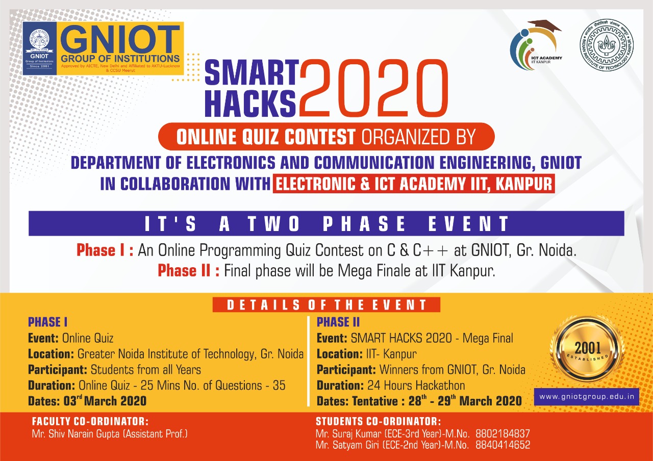 Smart Hack 2020 Online Quiz Contest organized by Department of ECE, GNIOT in collaboration with Electronic & ICT Academy IIT, Kanpur.