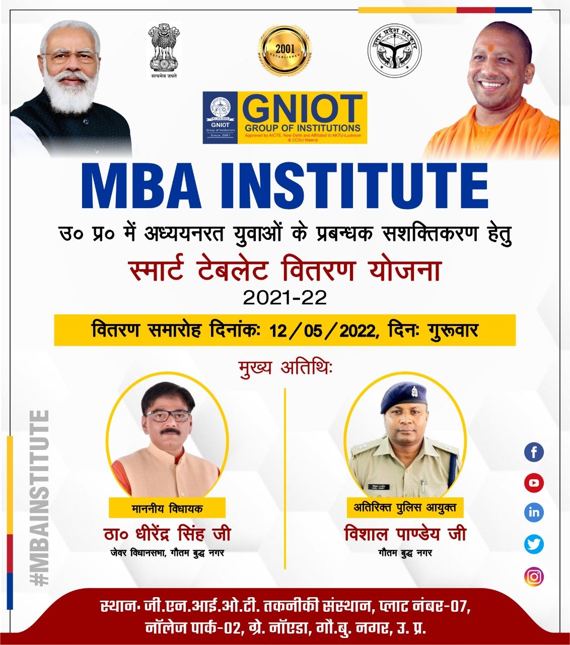 As advanced digital skills become more important for employment and entrepreneurial success, GNIOT MBA INSTITUTE is organizing a Tablet Distribution Ceremony for final year MBA & IMBA students under the Uttar Pradesh Free Tablet Yojana- an initiative of the state government under the Digishakti scheme. Honourable guests for this event is Thakur Dhirendra Singh MLA Jewar, Greater Noida, and Shri Vishal Pandey Ji Additional Deputy Commissioner of Police, Greater Noida.