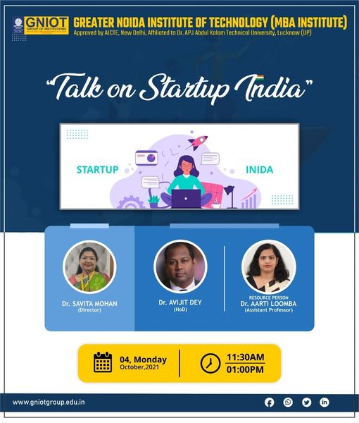 Greater Noida Institute of Technology - MBA Institute is organizing a Talk on "Startup India" for upcoming Batch of MBA and IMBA students. The session is aimed to provide an insight about how to organize, finance, run, monetize and slash their business. Key topics to be discussed in the session would be:-
