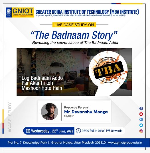 GNIOT MBA Institute is organising a LIVE CASE STUDY ON "THE BADNAAM STORY" Revealing the secret sauce of THE BADNAAM ADDA on Wednesday i.e 22nd of June, 2022 from 2:00 pm onwards in seminar hall.