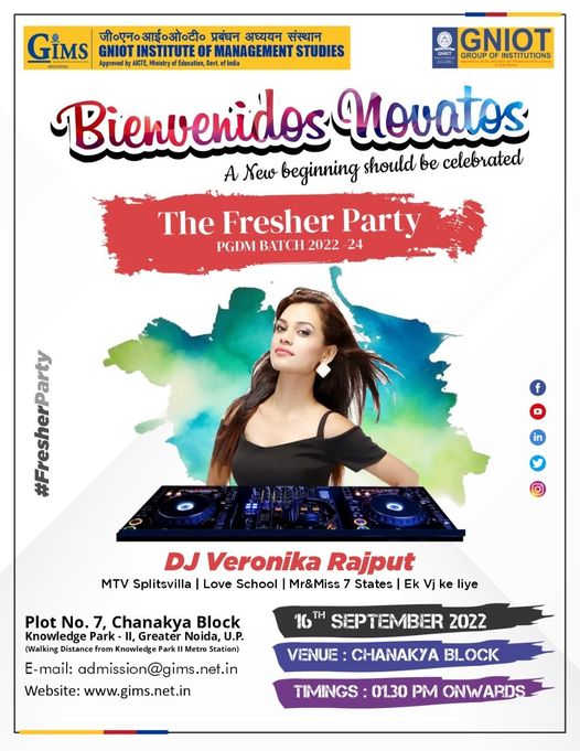 DJ Veronika of MTV Splitsvilla Fame is going to rock the floor at GIMS, Greater Noida on September 16, 2022 to welcome the PGDM 2022-24 Batch at BIENVENIDOS NOVATOS: The Freshers' Party.