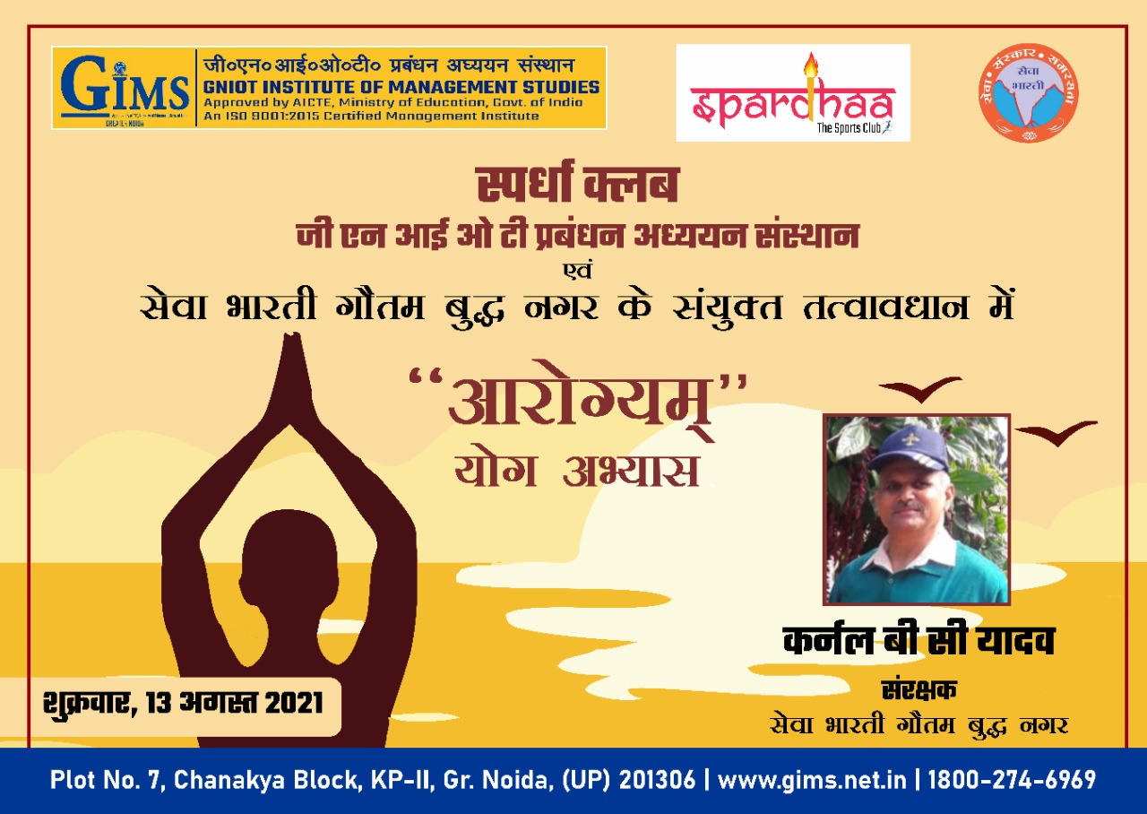 The sync of body and mind is an essential requirement to be a successful manager. To provide the insights of managing this art to its Future Managers, "Spardhaa- The Sports Club", GIMS Greater Noida in collaboration with Seva Bharti, Greater Noida is organizing Aarogyam- The Yog Abhyaas Session for PGDM I Year students on August, 13, 2021. The instructor for the session. is Col (Retd.) B C Yadav, Patron, Seva Bharati, Gautam Buddha Nagar.