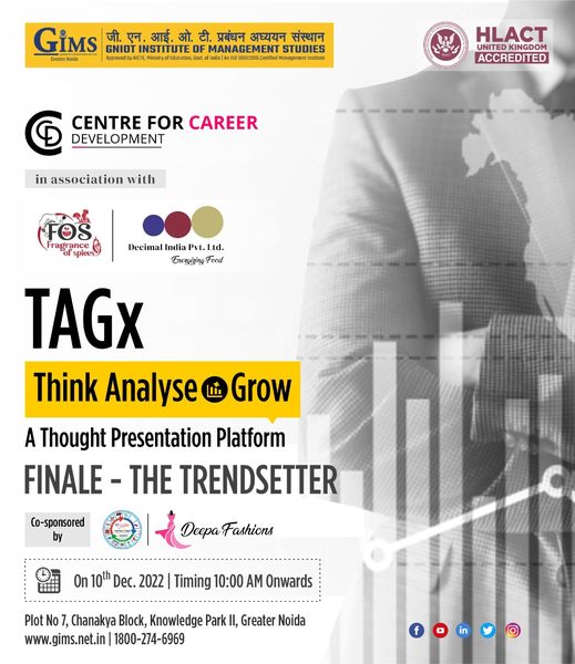 The month long event TAGx – Think, Analyse and Grow by Centre for Career Development (CCD), GIMS, Greater Noida, culminates at its #Finale - The Trendsetter. The Finale is being organised in association with Fragrance of Spices and Decimal India Pvt. Ltd. on December 10, 2022 from 10:30 AM onwards. The #Trendsetter is co-sponsored by Welcome Printing Press and Deepa Fashions.