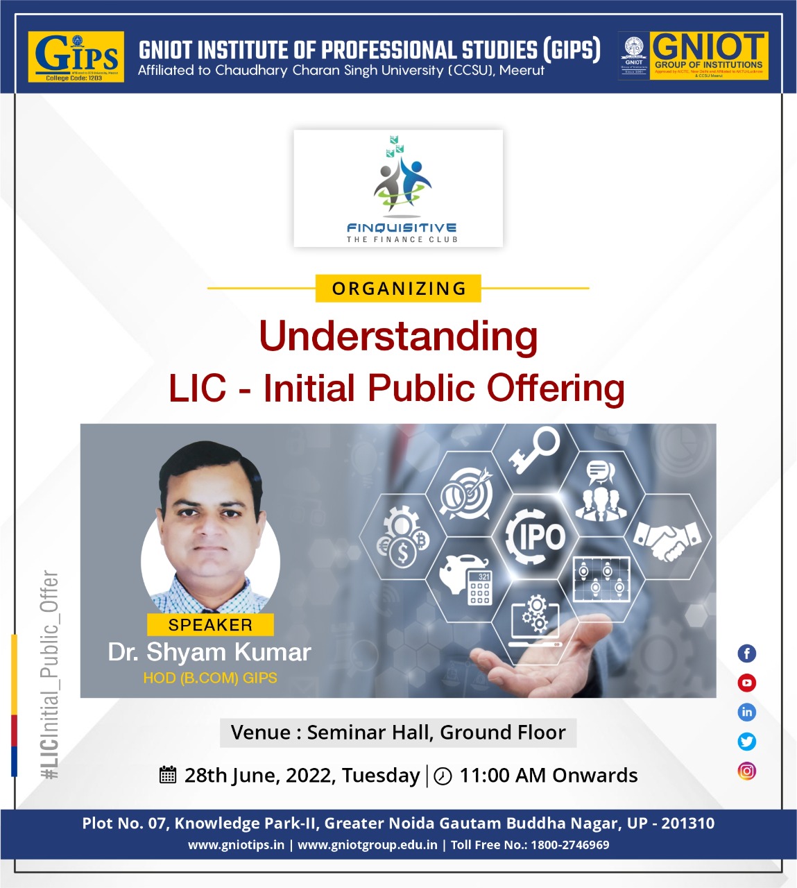 With the aim of enhancing our dear students skills and knowledge, “FINQUISITIVE” the Finance Club of GIPS is organizing a session on “Understanding LIC - Initial Public Offering” for all the students of BBA, BCA, B.COM and B.SC under the effective supervision of the Principal of the Institute Prof. (Dr.) Savita Mohan. The session will be held on -