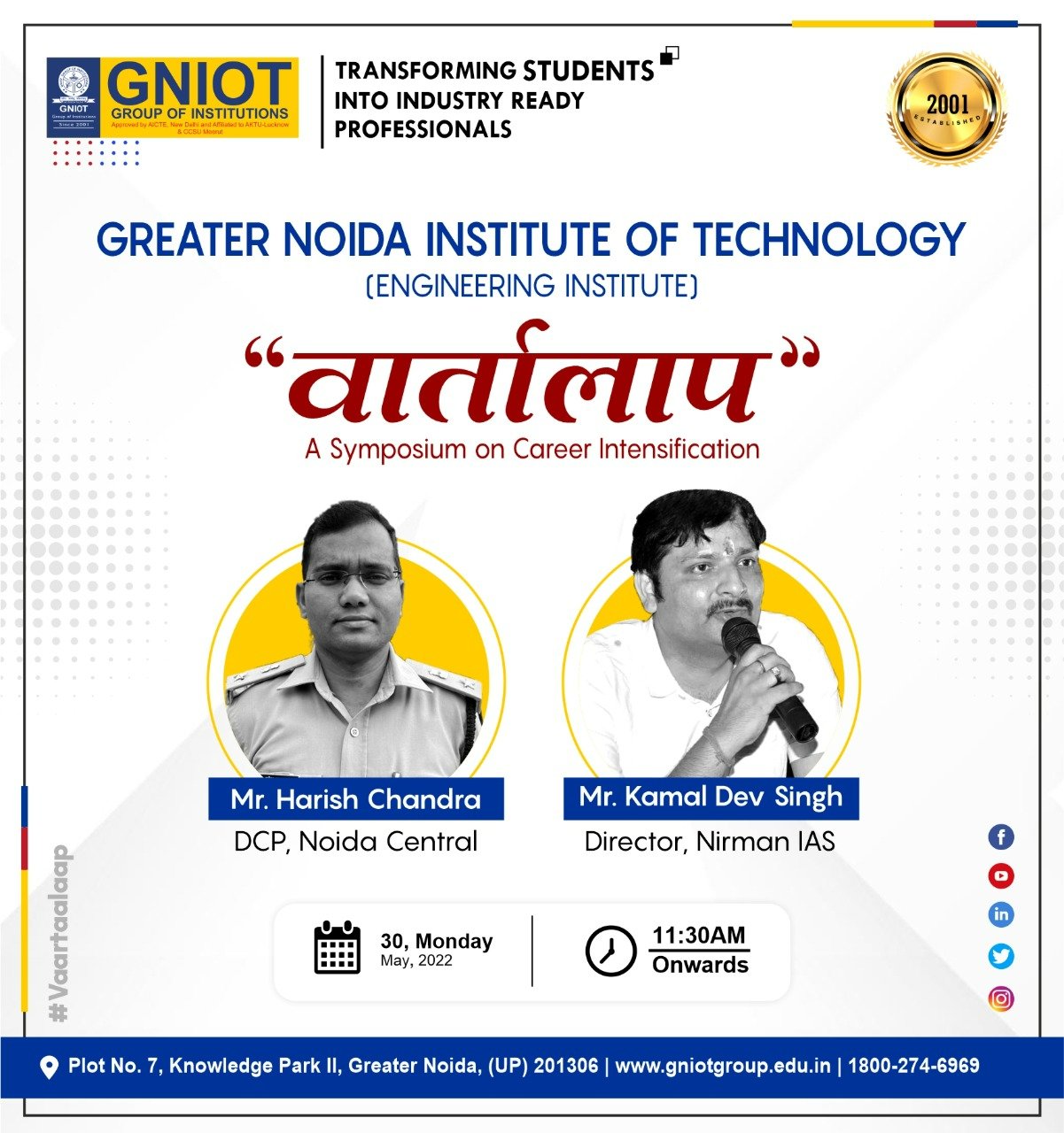 Keeping this thought in mind, Greater Noida Institute of Technology is organising "Vartalaap", a symposium on career intensification for engineering students of all branches at 11.30 AM on Monday, 30 May 2022.