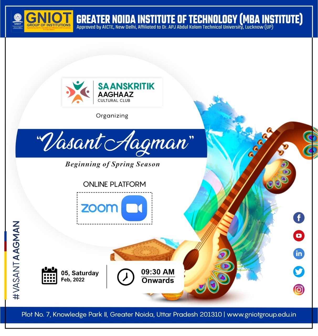 On the auspicious occasion of Basant Panchami, GNIOT MBA Institute's Cultural Club (SAANSKRITIK AAGHAAZ) is commemorating 'VASANT AAGMAN' to pray to Goddess Saraswati to shower a huge wealth of knowledge on all of us. The event is scheduled for February 05, 2022, virtually on Zoom Platform from 9:30 a.m. onwards. During the ceremony, participants will dress in yellow and offer prayers to "Maa Saraswati," the goddess of learning. Following that, the students will welcome the Cheerful Season of Spring with poetry, melodious singing, and dance.