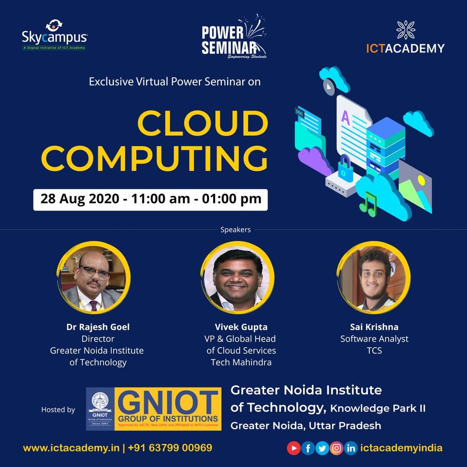Exclusive virtual power seminar on Cloud Computing is being organized by the department of Computer Science and Engineering ,GNIOT Greater Noida on 28th August 2020. You all are invited to join the same.