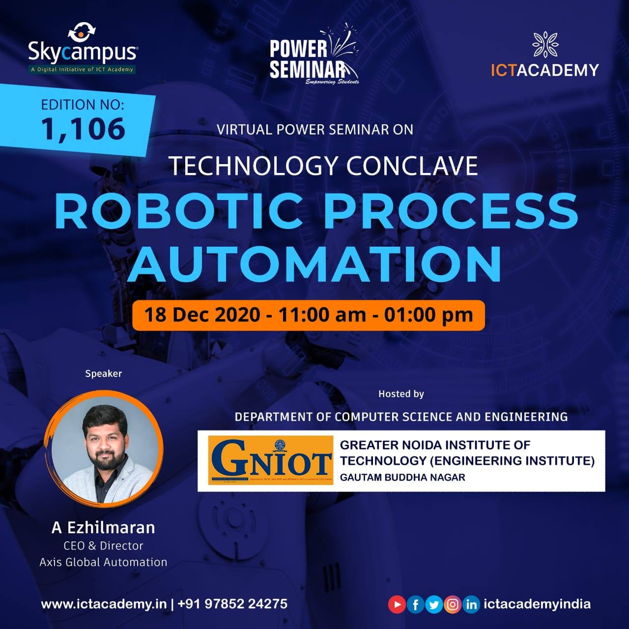 In the series of virtual power seminars, department of Computer Science & Engineering is organizing one more on 18th Dec'20. Topic of the seminar is Robotic Process Automation.