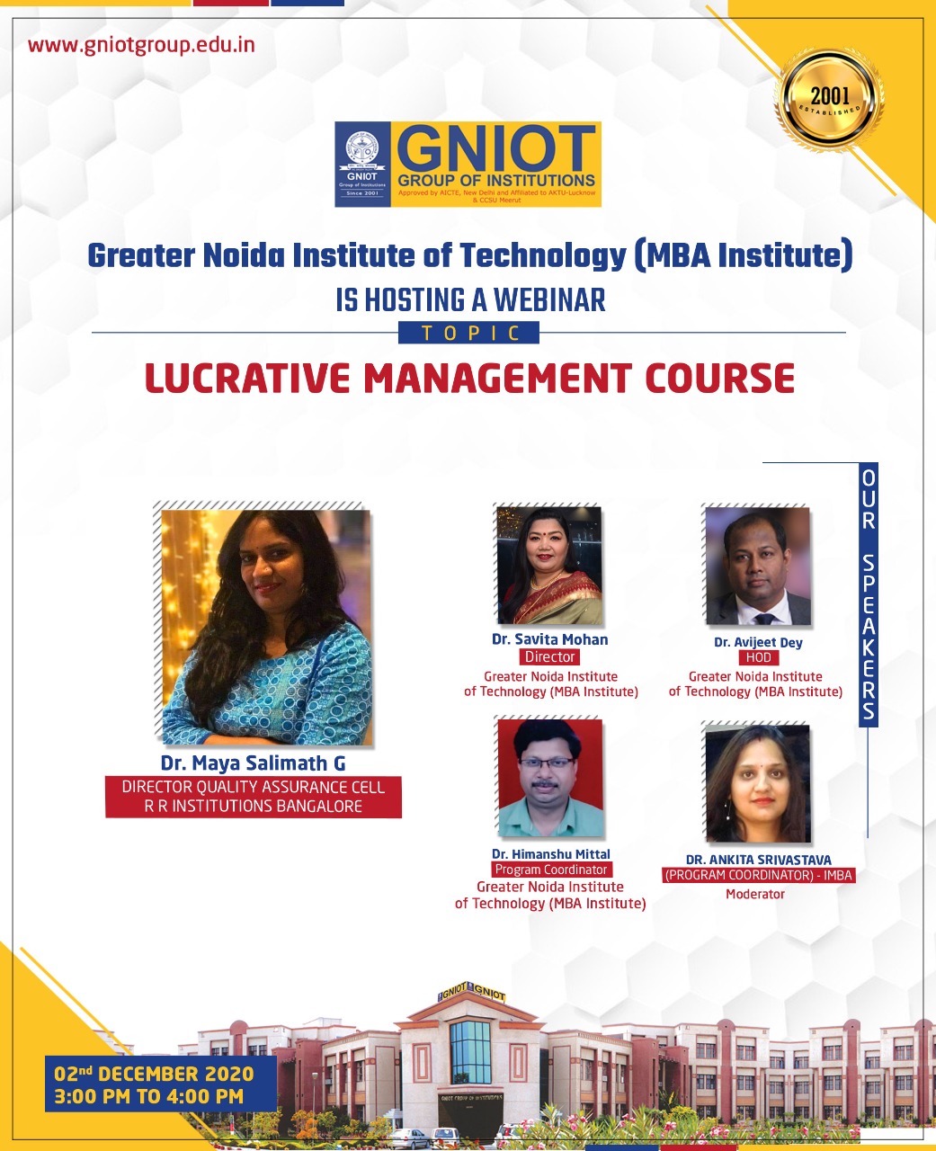 GNIOT-MBA Institute under their webinar series is hosting a webinar titled “Lucrative Management Course” on 2nd December 2020. The eminent speaker of the webinar is DR. Maya Salimath G as a spokesperson. She have vast experience of 14 year in A3TR (Academics, Administration and Accreditation, Training and Research). She currently takes care of all the Quality Enhancement and Sustenance strategies at the 14 Educational Units of R. R. Institutions.