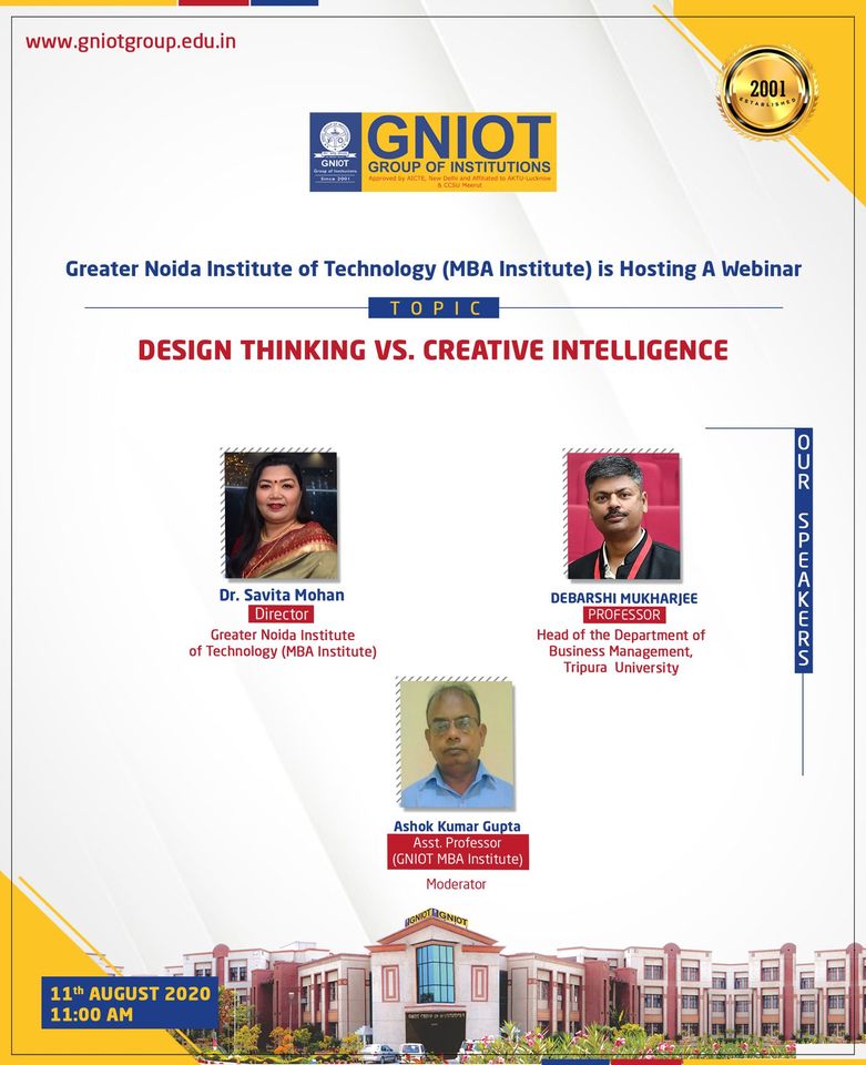 GNIOT MBA Institute, Greater Noida, is organizing a webinar on “Design Thinking Vs Creative Intelligence” on 11th August, 2020 (Tuesday) from 11:00 AM to 12:00 PM.
