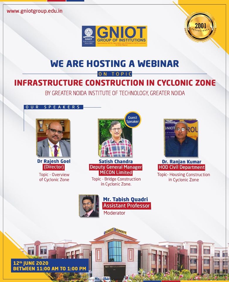 Description: Greater Noida Institute of Technology (Engineering Institute) Civil Engineering Department is organizing a webinar on the Infra Structure construction in Cyclonic zone.