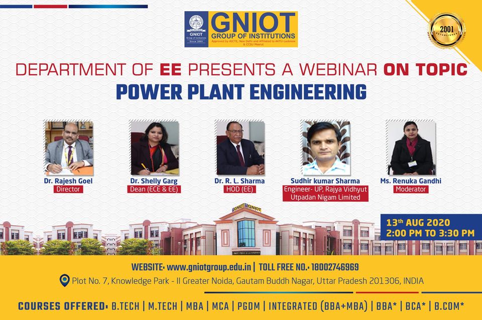 Department of Electrical Engineering, GNIOT GROUP OF INSTITUTIONS, GREATER NOIDA, is organizing a webinar on “Power Plant Engineering” on 13th Aug, 2020 between 02:00 PM to 03:30 PM.