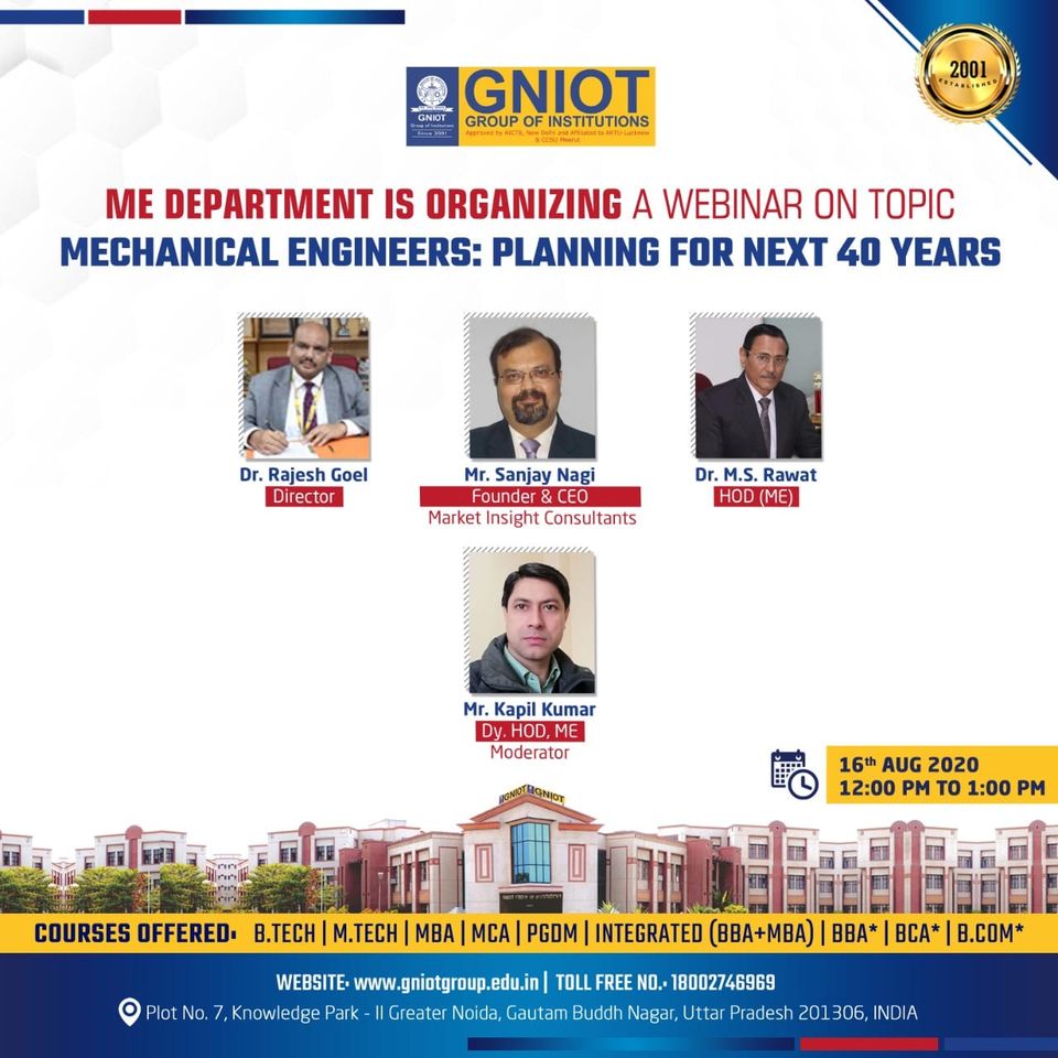 Department of Mechanical Engineering, GNIOT GROUP OF INSTITUTIONS, GREATER NOIDA, is organizing a webinar on “Mechanical Engineers: Planning for next 40 years” on 16th August, 2020 from 12:00 PM to 1:00 PM.