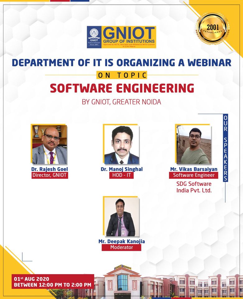 Department of Information Technology, GNIOT GROUP of INSTITUTIONS, GREATER NOIDA,is organizing a webinar on "Software Engineering" on 1st August, 2020 between 12:00 PM to 2:00 PM.